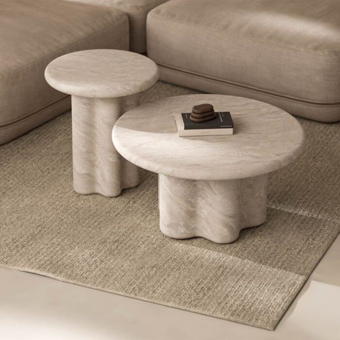 La mesa de centro LUIGI destaca por su diseño elegante y refinado, que combina la fuerza del cemento con la delicadeza visual del efecto mármol travertino. Esta combinación de materiales otorga a la pieza un carácter escultórico que captura la atención sin necesidad de excesos decorativos.