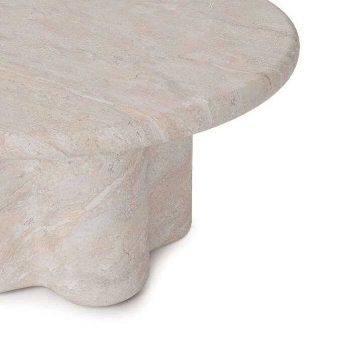 Mesa redonda fabricada en cemento con acabado mármol travertino.
