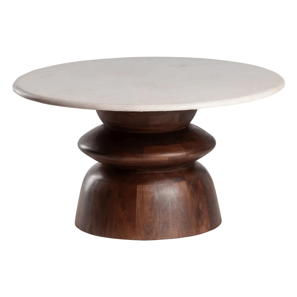 Mesa de centro en color beige y marrón fabricada en mármol, combinado con madera de mango.