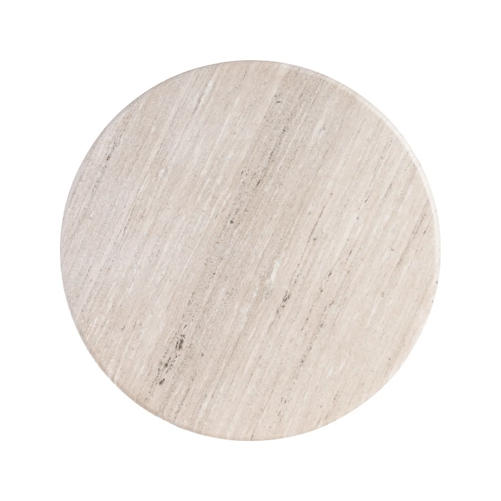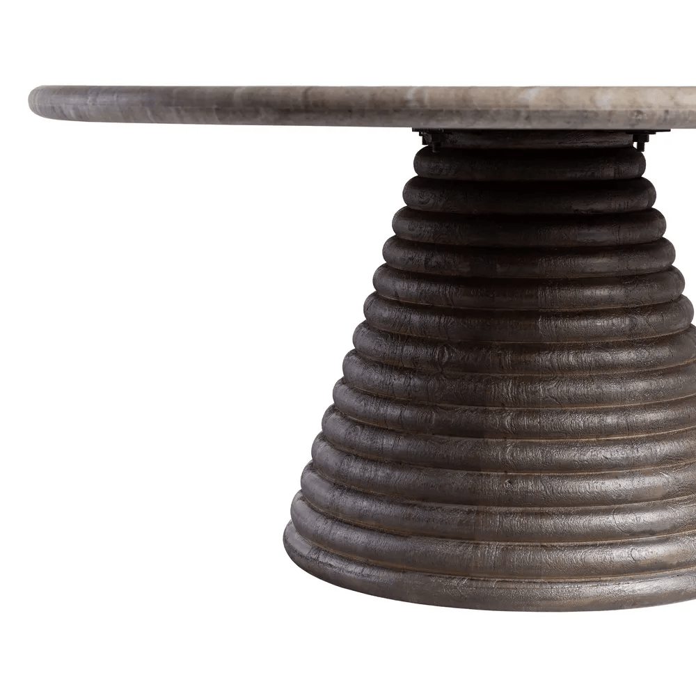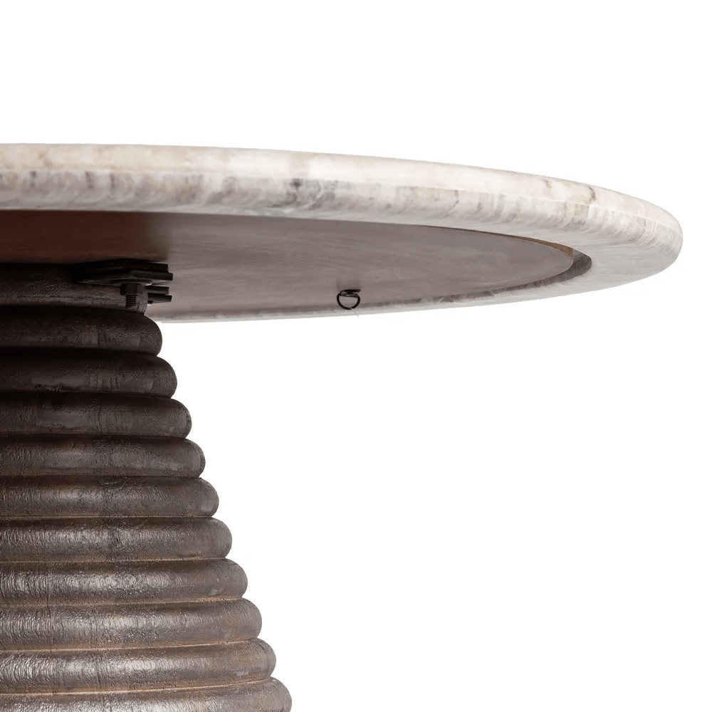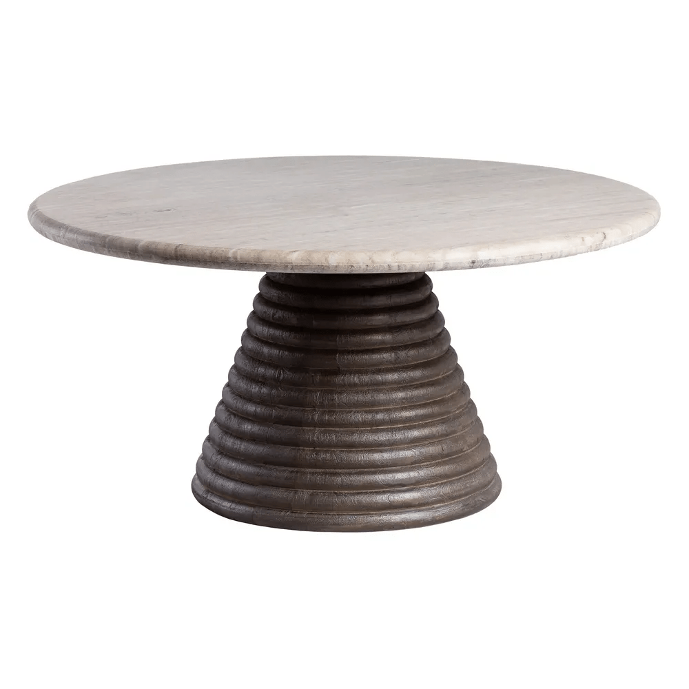 El tablero redondo de mármol natural aporta luminosidad y sofisticación, mientras que la base cónica elaborada en madera de mango con acabado oscuro añade carácter y estabilidad. Su equilibrio entre materiales nobles y diseño moderno la convierte en una mesa funcional y decorativa a la vez.