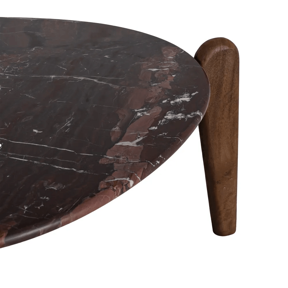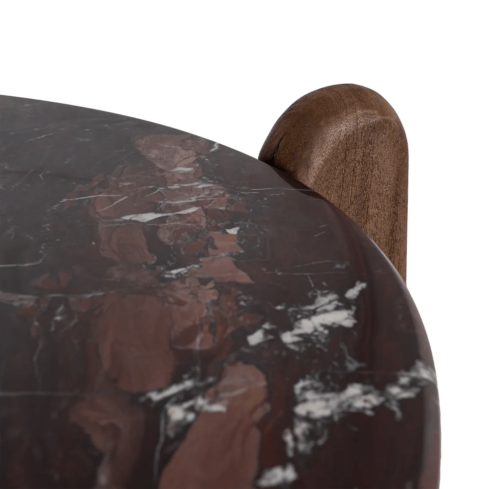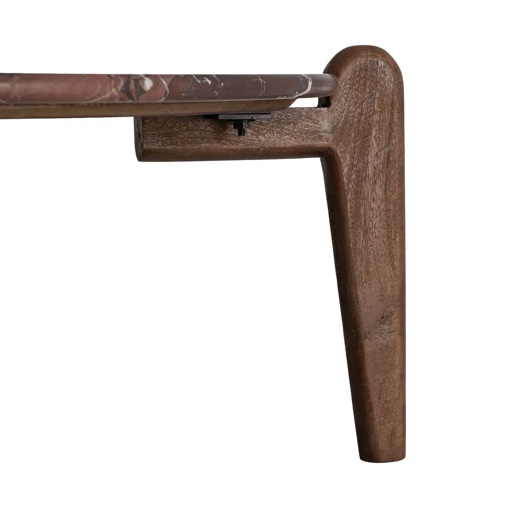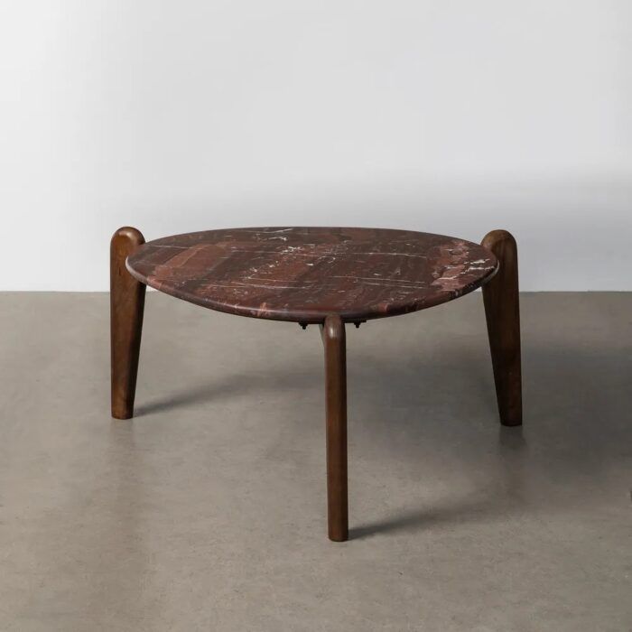 Mesa de centro en color marrón fabricada en mármol, combinado con madera de mango.
