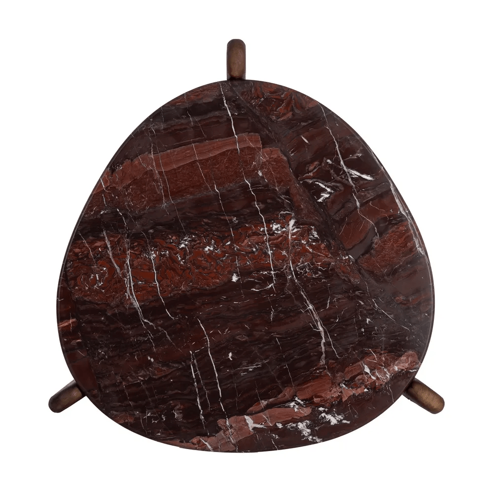 Una pieza que combina diseño y autenticidad. Esta mesa de centro está fabricada en mármol natural y madera de mango maciza, fusionando la elegancia del mármol con la calidez de la madera. Su estructura de tres patas curvas aporta un aire escultórico y contemporáneo, mientras que su tablero de 2 cm de grosor realza las vetas únicas del mármol.