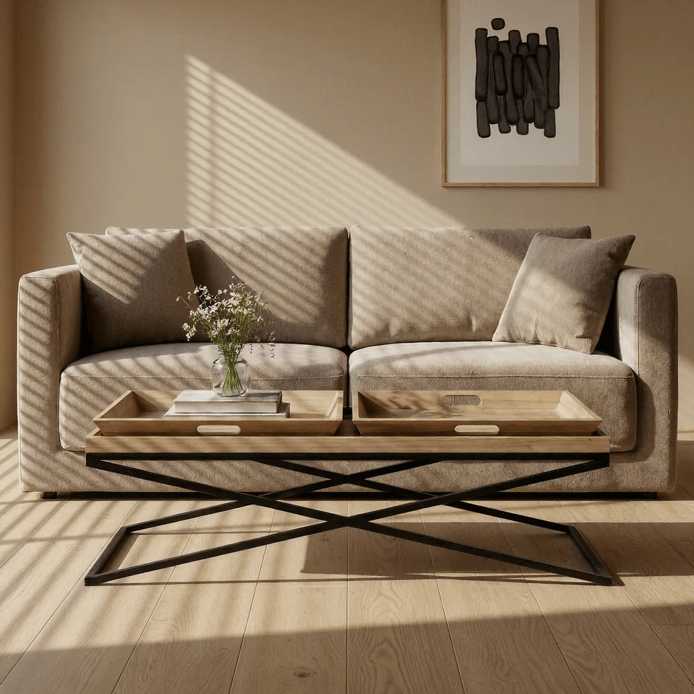 Está fabricada en MDF y hierro, una combinación que aporta calidez visual y, al mismo tiempo, una estructura firme y estable. Su diseño se destaca por incluir dos bandejas extraíbles, perfectas para organizar objetos, servir bebidas o sumar un toque decorativo con total practicidad.