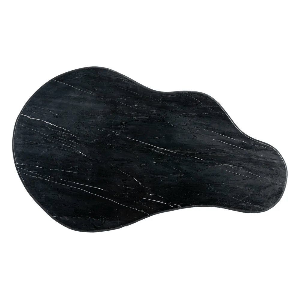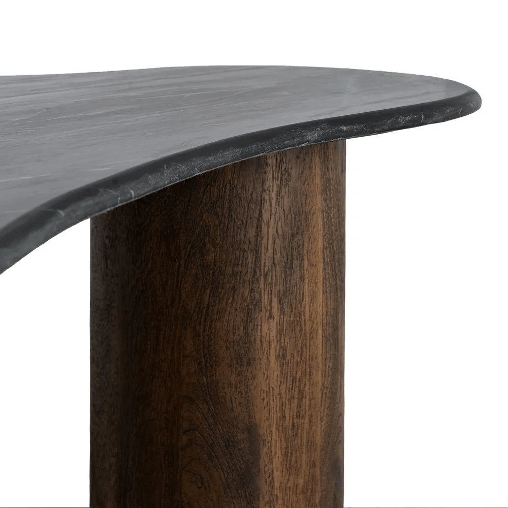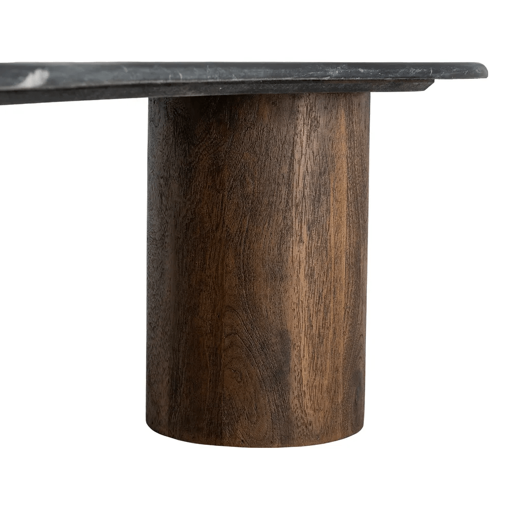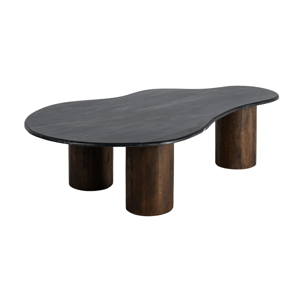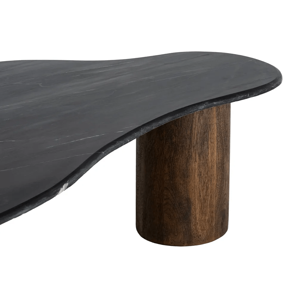 Aporta elegancia y carácter a tu sala con esta mesa de centro de diseño orgánico. Fabricada en mármol natural negro y madera de mango maciza en tono marrón cálido, combina materiales nobles que aportan sofisticación y calidez a cualquier espacio. Su tablero de 2 cm de grosor descansa sobre sólidas patas cilíndricas, creando un equilibrio entre la forma y la función.
