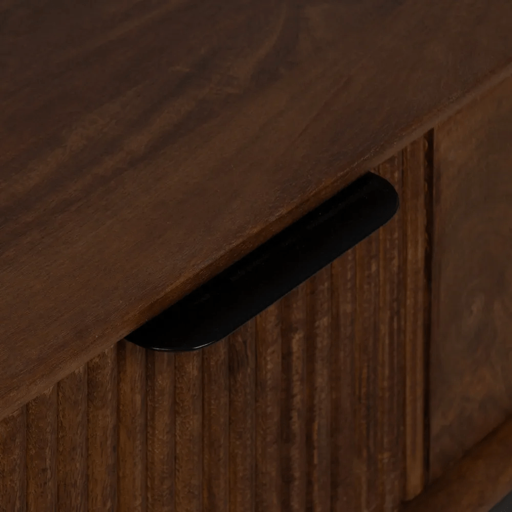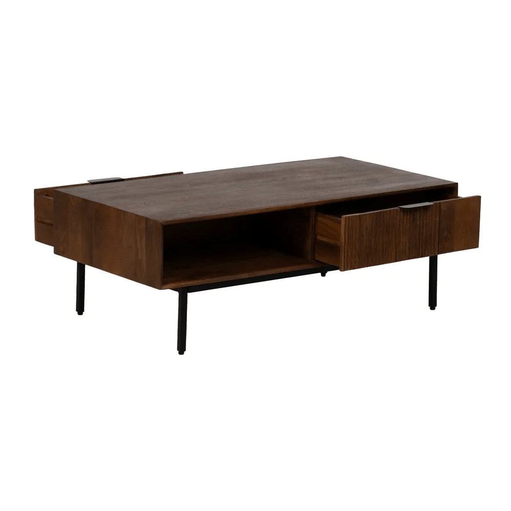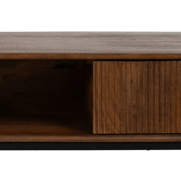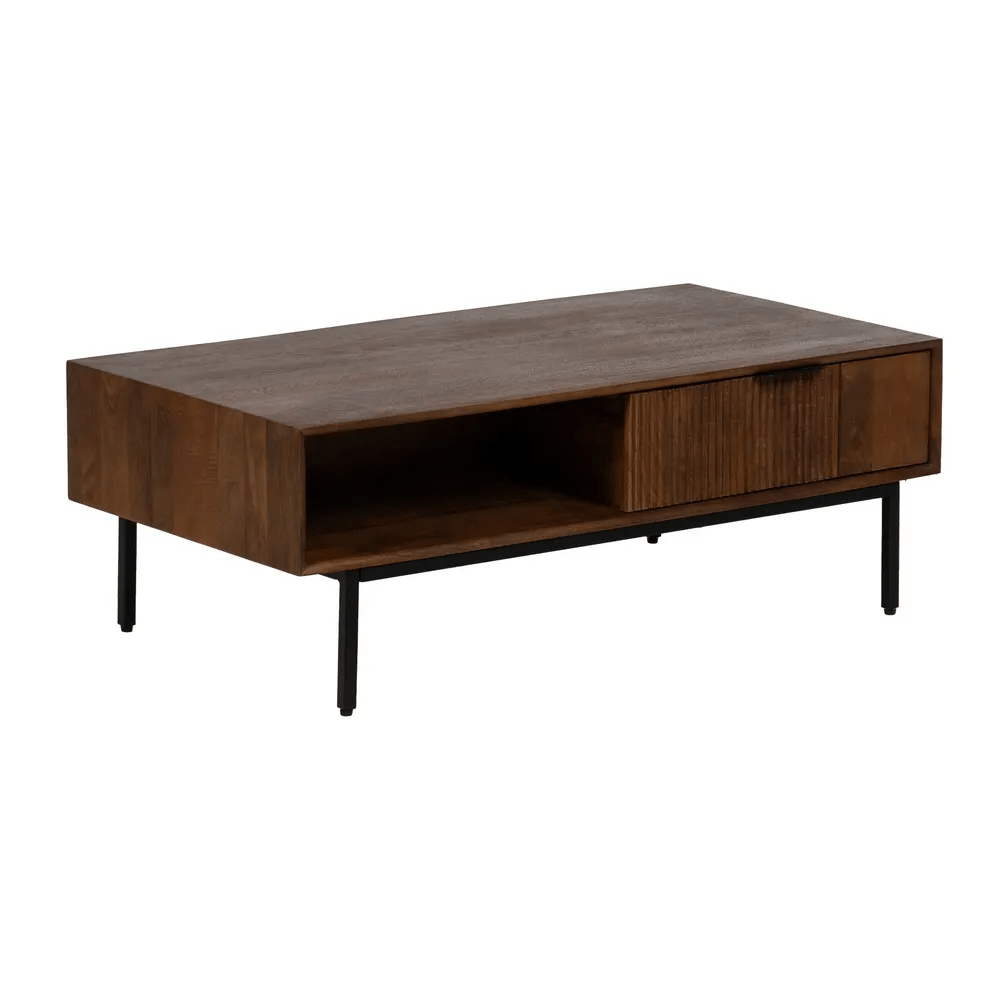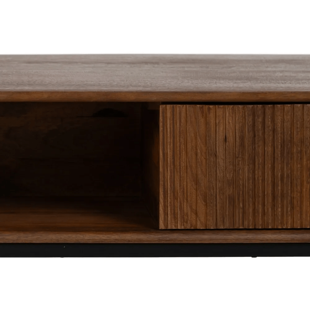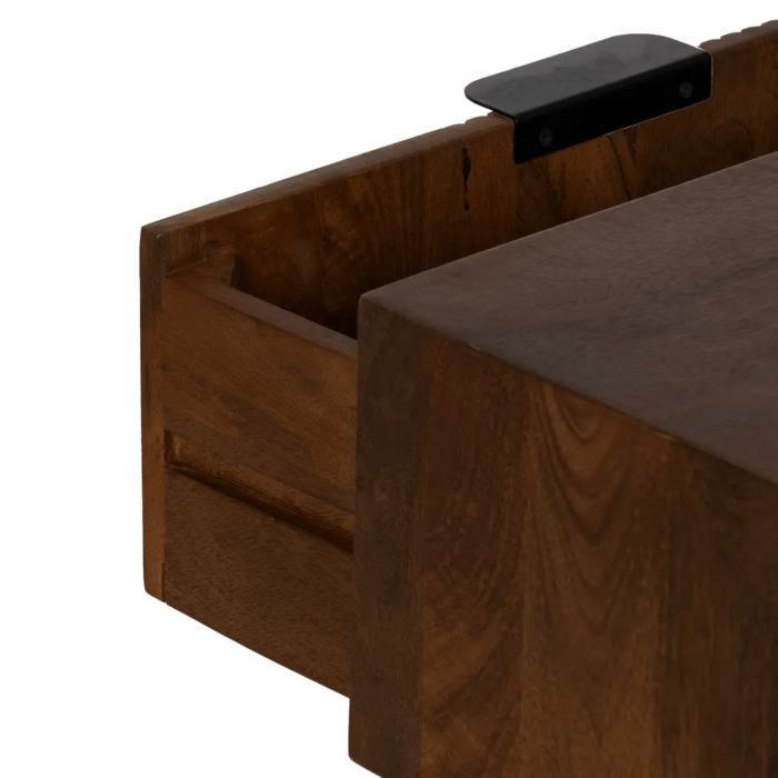 La mesa de centro Talaia combina elegancia natural y funcionalidad en un diseño moderno con inspiración artesanal. Fabricada en madera de mango maciza y con patas y tiradores de hierro, esta pieza destaca por su robustez y su estilo atemporal. El acabado marrón natural resalta las vetas de la madera, aportando calidez y carácter al salón.