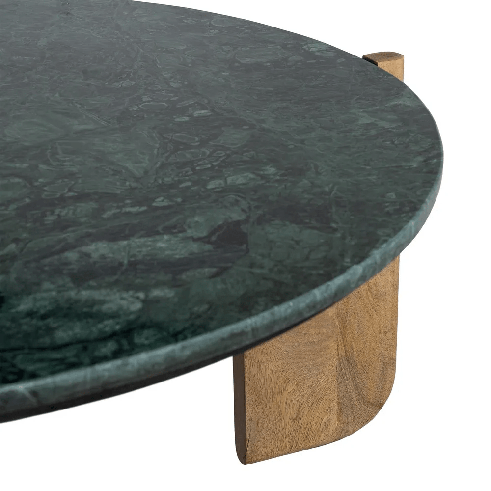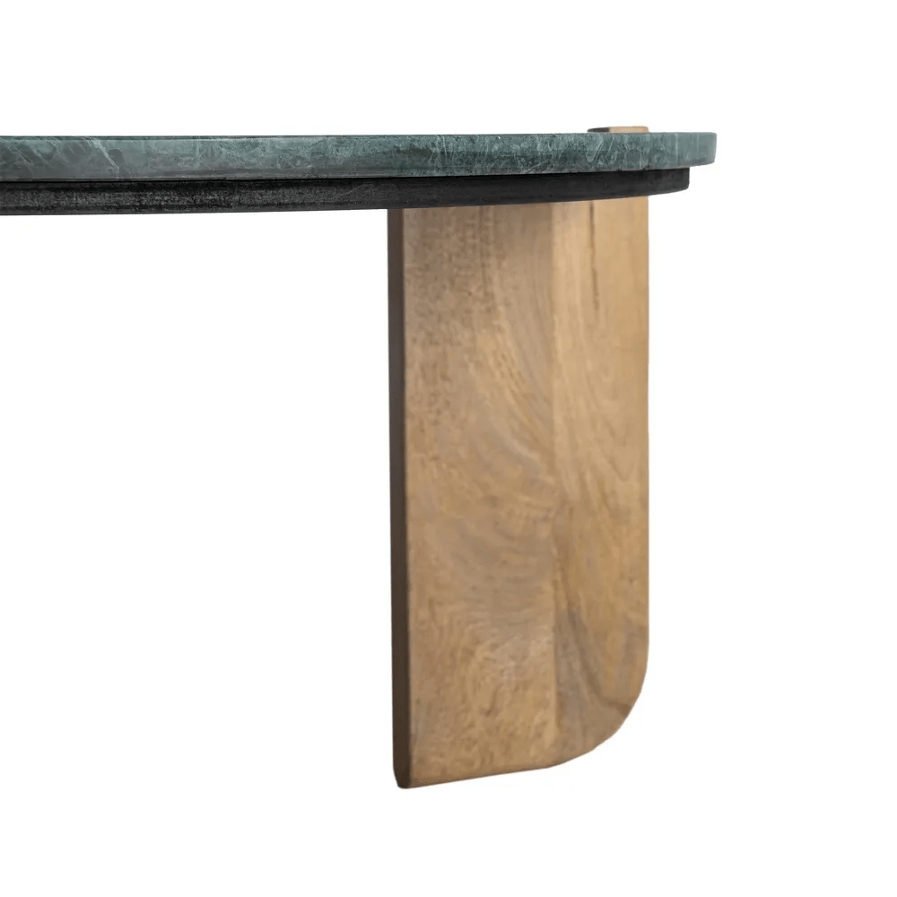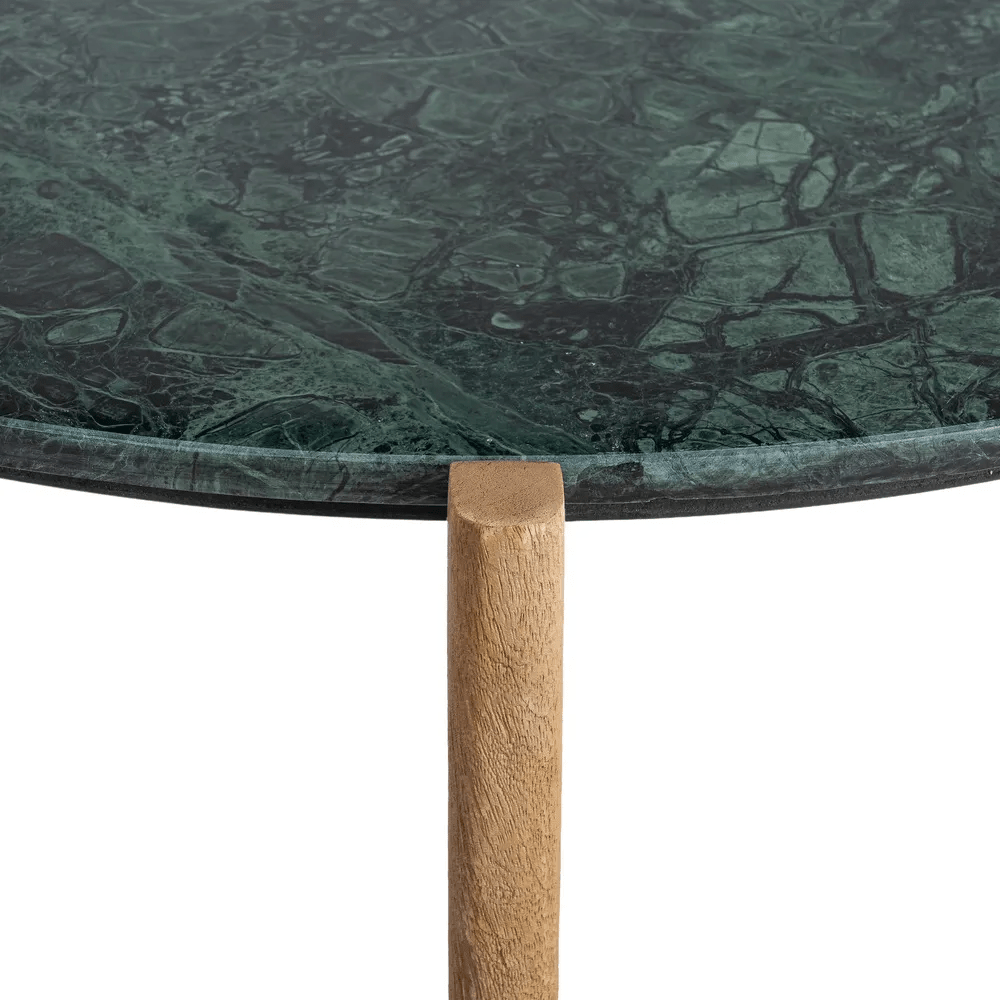 Inspirada en la armonía entre lo natural y lo contemporáneo, esta mesa de centro combina la sofisticación del mármol verde con la calidez de la madera de mango maciza. Su diseño equilibrado y escultórico destaca por su base de tres patas curvas y su tablero de 2 cm de grosor, que realza las vetas únicas del mármol.