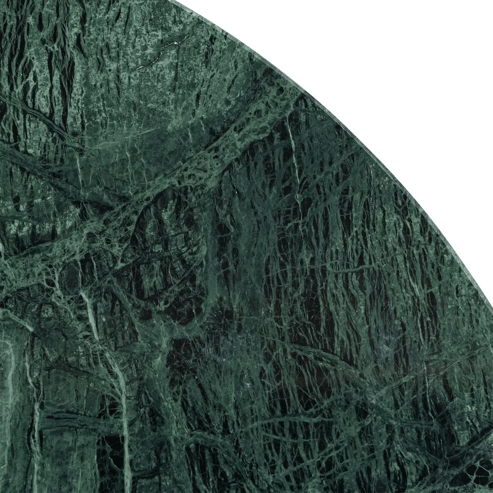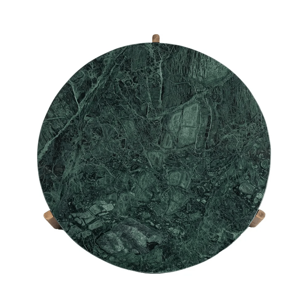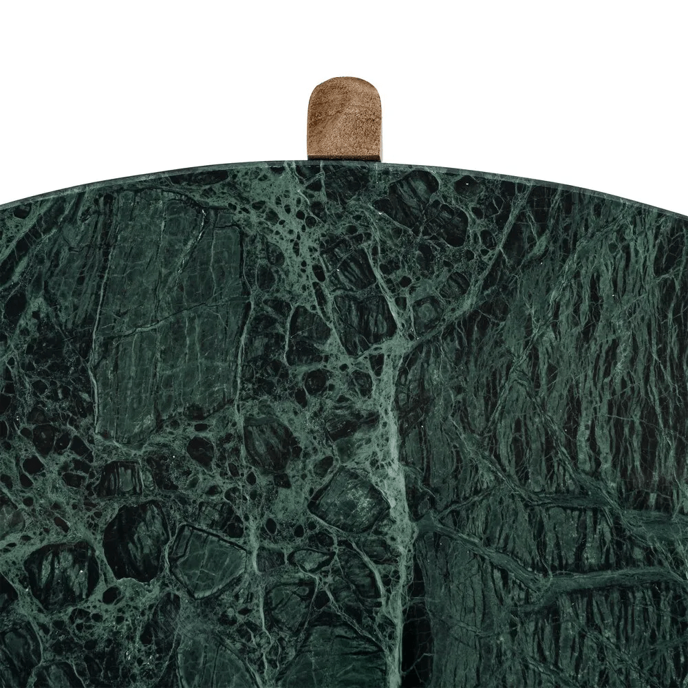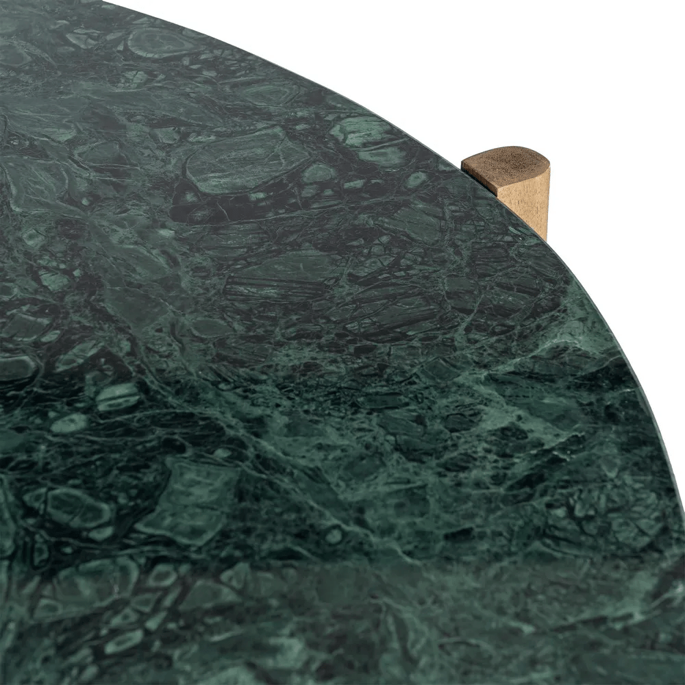 Inspirada en la armonía entre lo natural y lo contemporáneo, esta mesa de centro combina la sofisticación del mármol verde con la calidez de la madera de mango maciza. Su diseño equilibrado y escultórico destaca por su base de tres patas curvas y su tablero de 2 cm de grosor, que realza las vetas únicas del mármol.