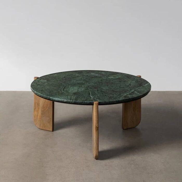 Mesa de centro en color verde y natural fabricada en mármol, combinado con madera de mango.