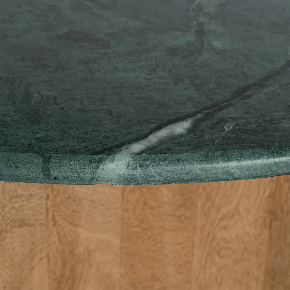 Mesa de comedor redonda en color verde y natural fabricada en mármol, combinado con madera de mango.