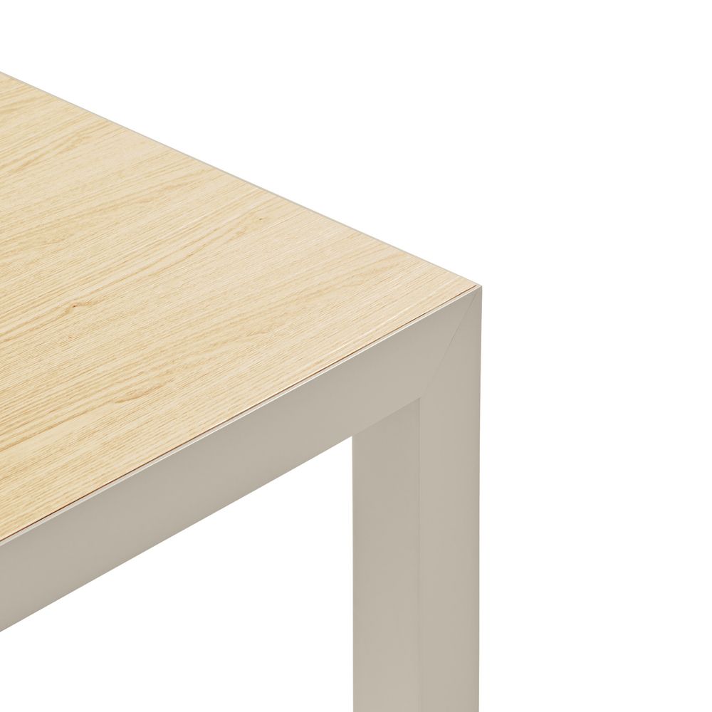 Mesa de comedor en color roble y arena fabricada en chapa de roble, combinado con metal.