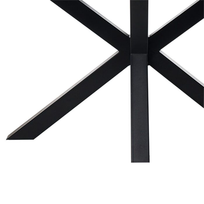 La base está compuesta por patas gruesas de metal que se entrecruzan, creando una estructura artística y estable.