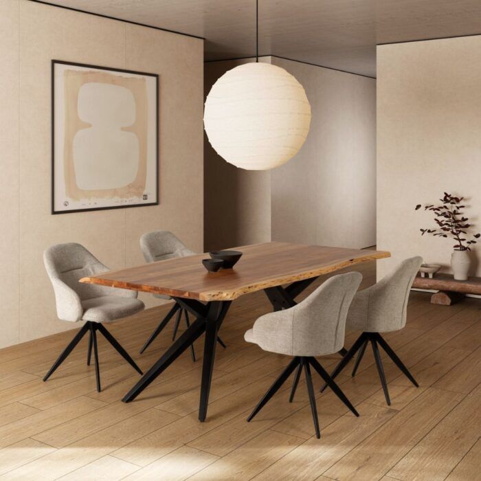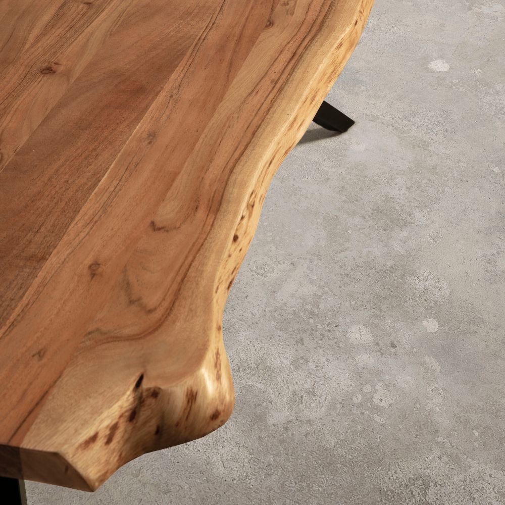 La mesa de comedor Mudri combina la belleza natural de la madera maciza de acacia con la solidez de una estructura de metal negro, creando una pieza que destaca por su estilo industrial moderno con toques orgánicos. Su superficie presenta un acabado natural con veta visible, que resalta las formas y texturas únicas de la madera, mientras que los bordes irregulares conservan el encanto artesanal de cada mesa.