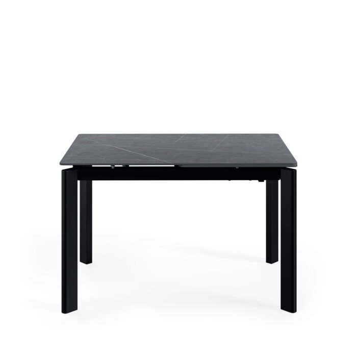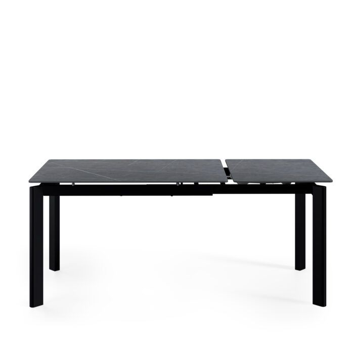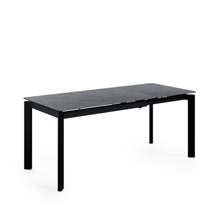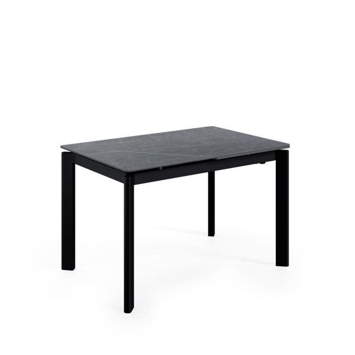 Mesa de comedor extensible en color gris y negro fabricada en porcelánico, combinado con metal.