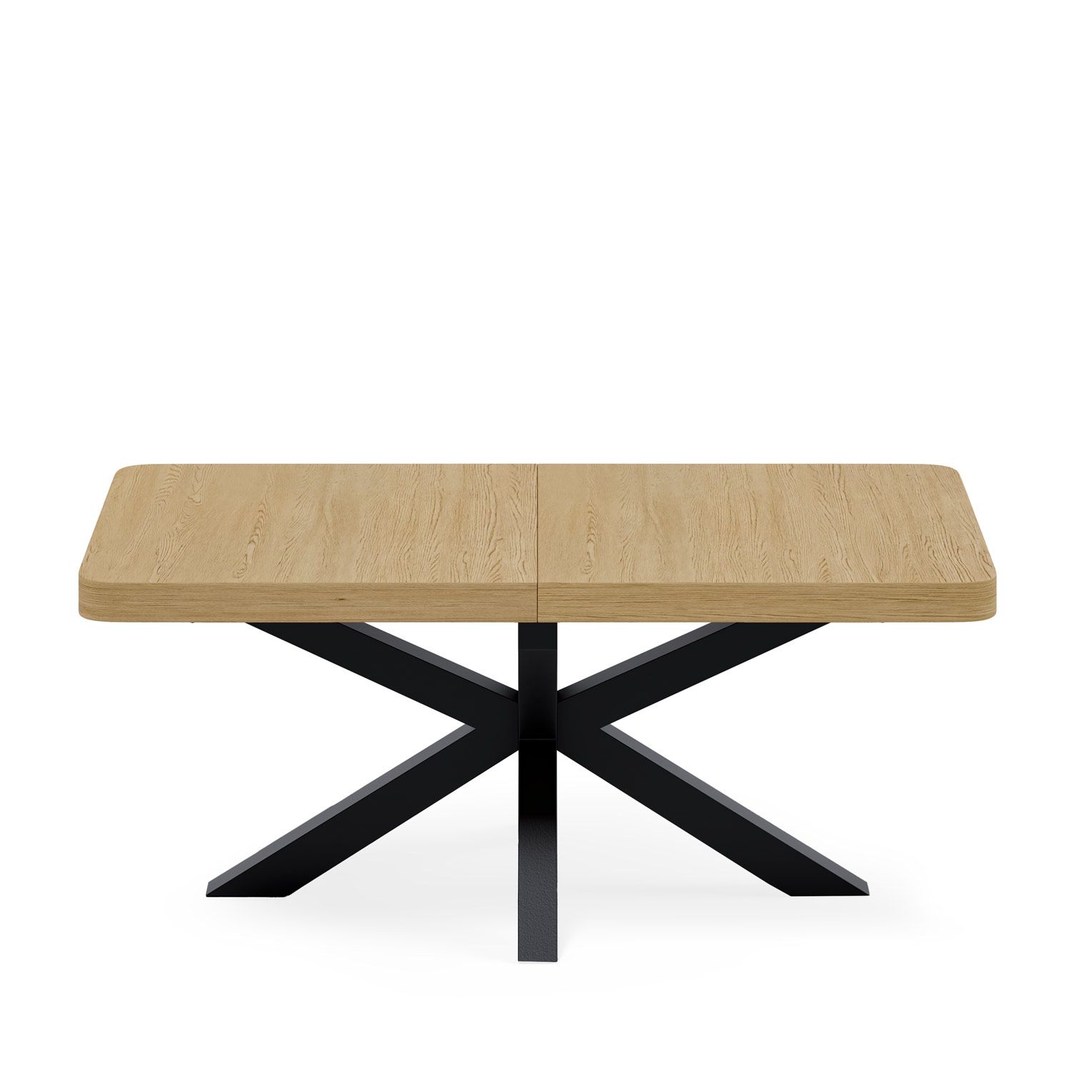 Mesa de comedor extensible en color roble y negro fabricada en chapa de roble, combinado con metal.