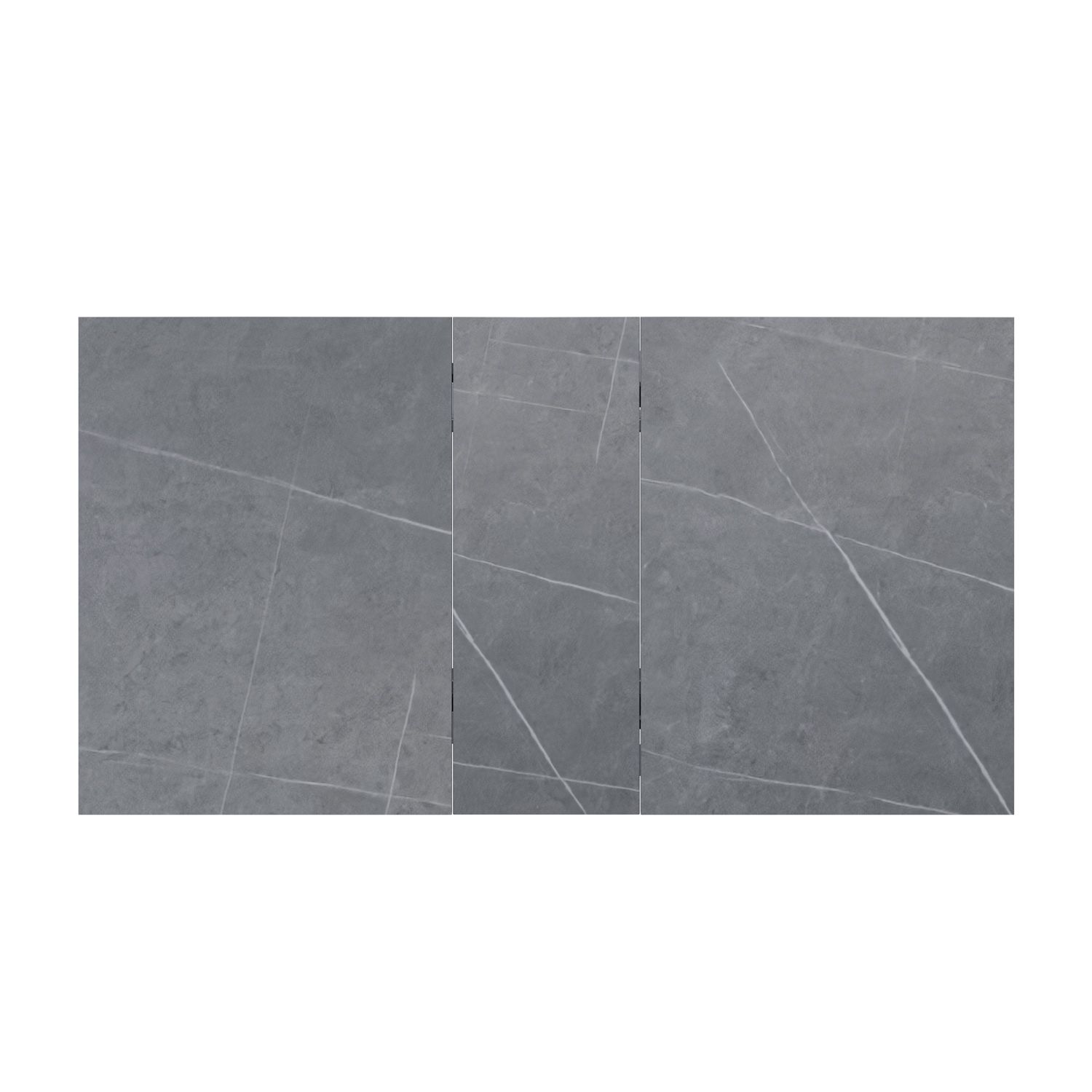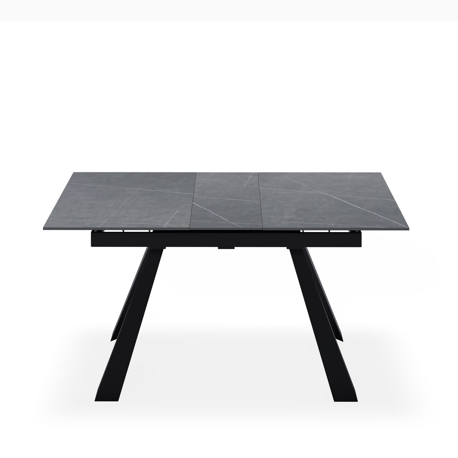 Mesa de comedor extensible en color gris y negro fabricada en porcelánico, combinado con metal.