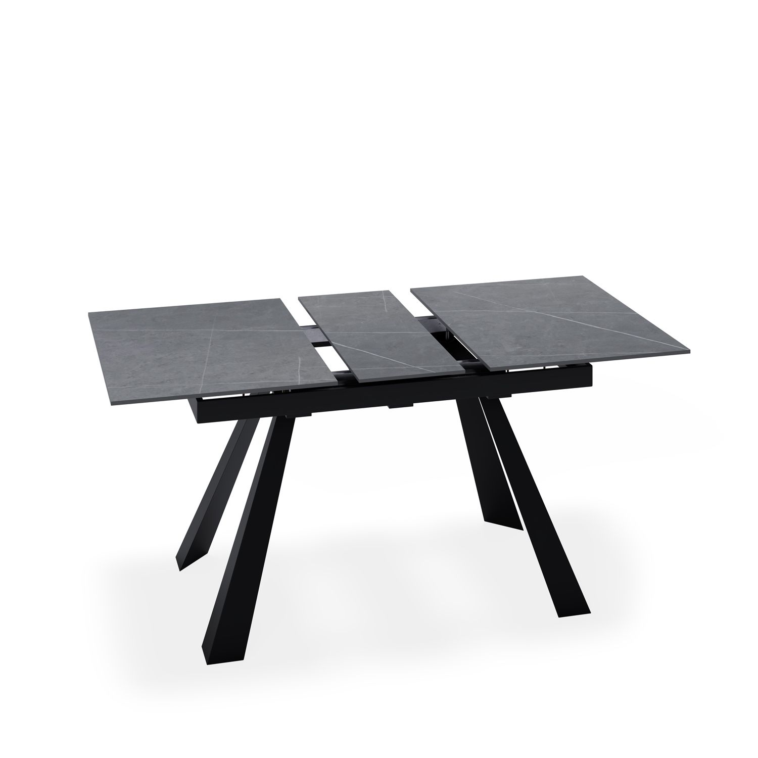 Mesa de comedor extensible en color gris y negro fabricada en porcelánico, combinado con metal.