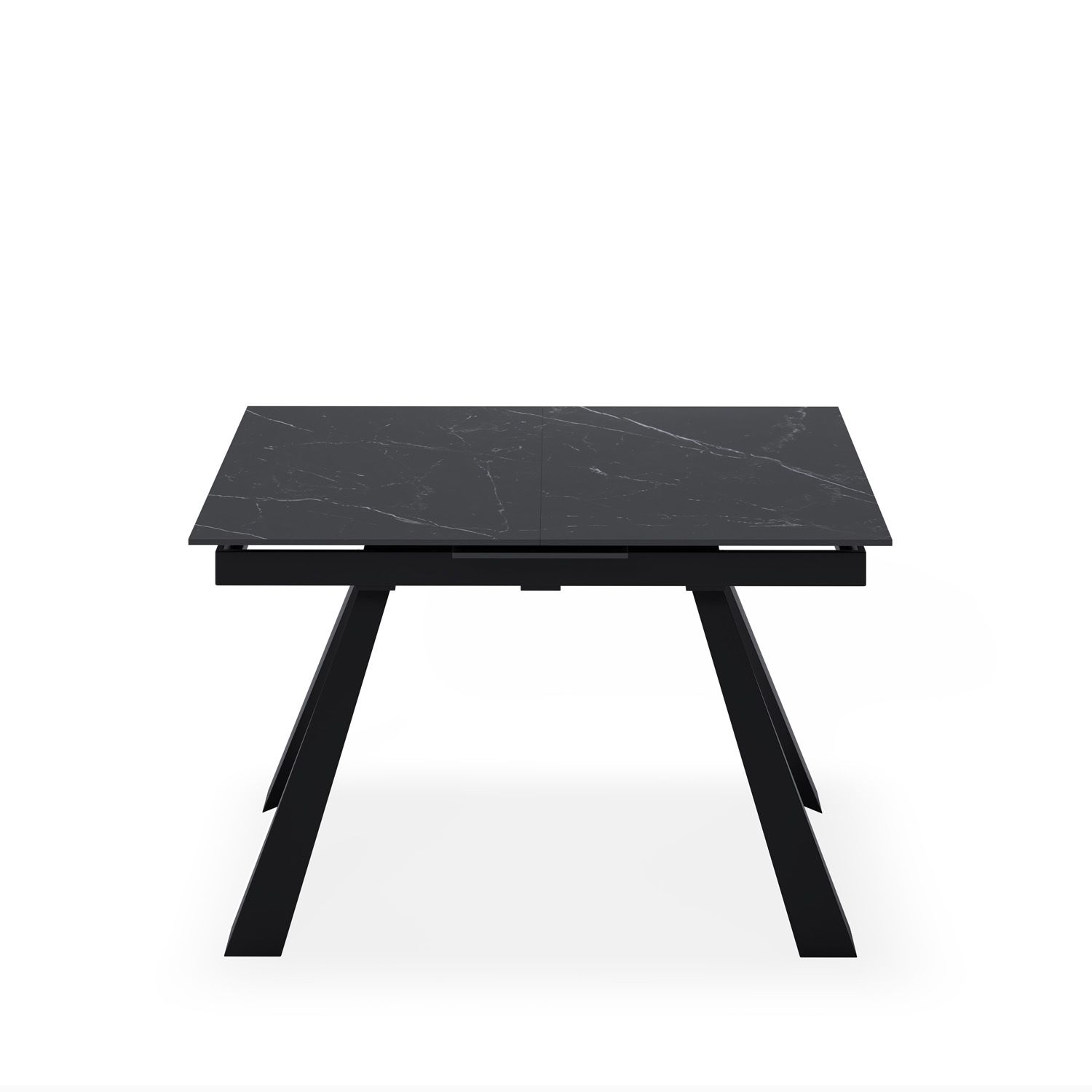 Mesa de comedor extensible en color negro fabricada en porcelánico, combinado con metal.