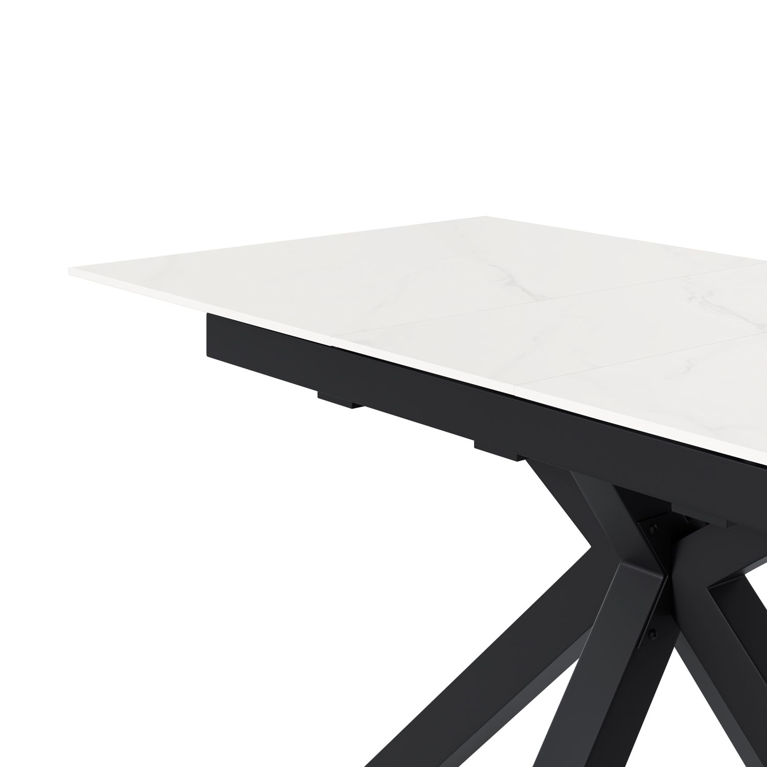 Mesa de comedor extensible en color blanco y negro fabricada en porcelánico, combinado con metal.