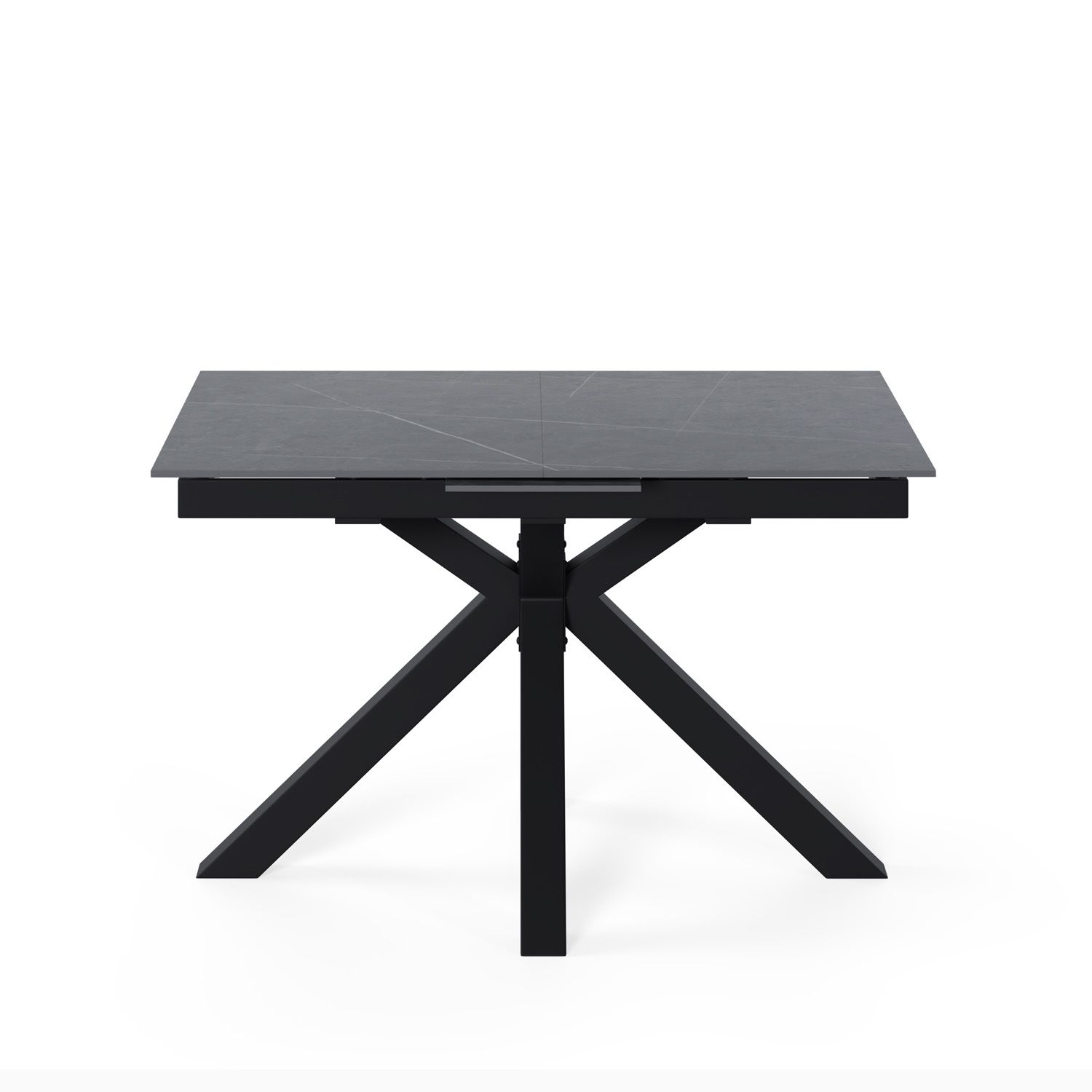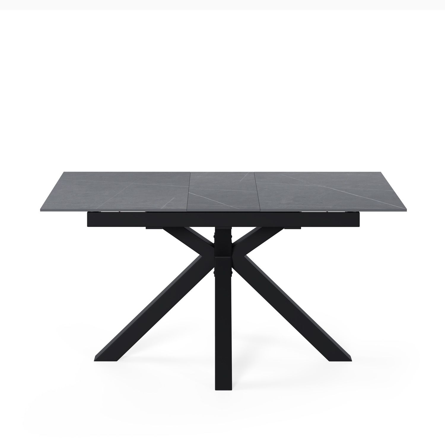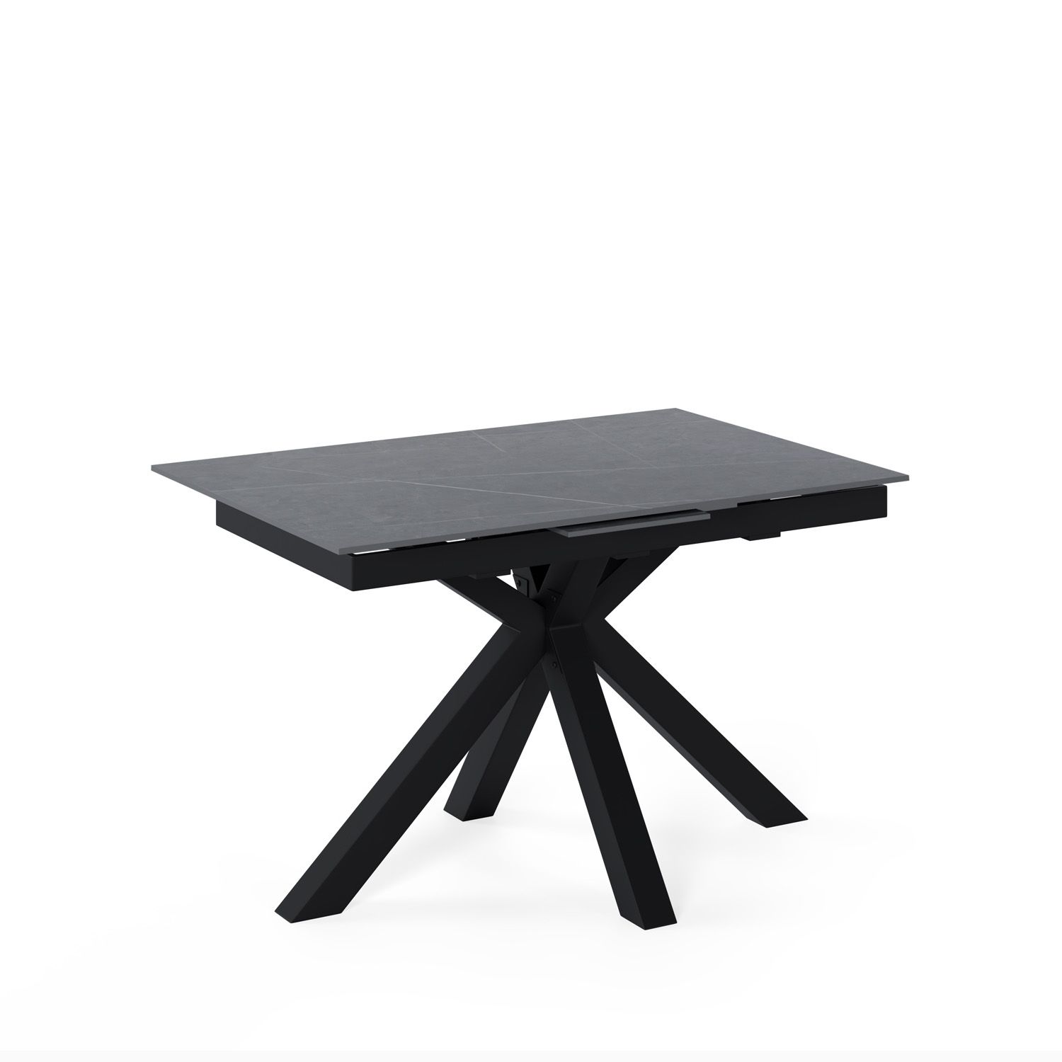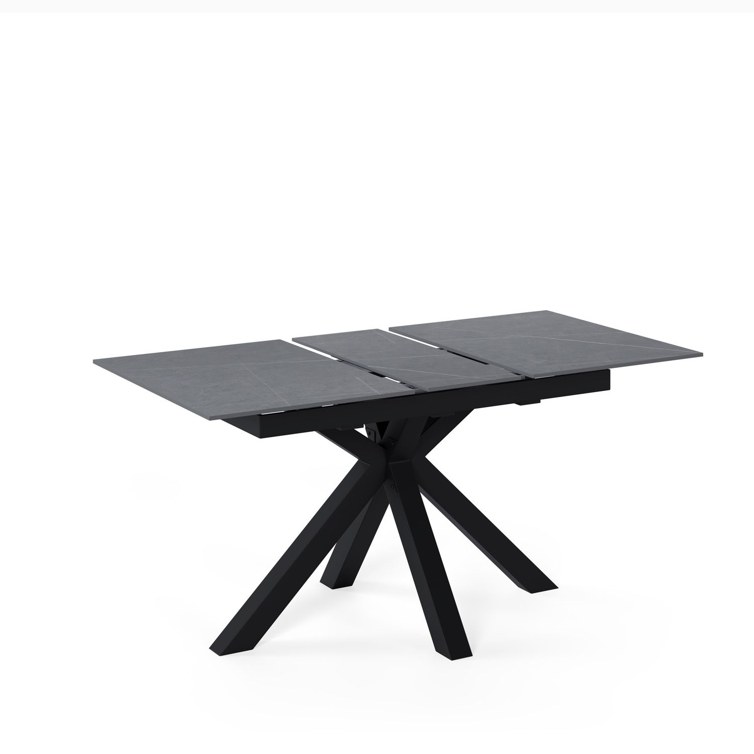 Mesa de comedor extensible en color gris y negro fabricada en porcelánico, combinado con metal.