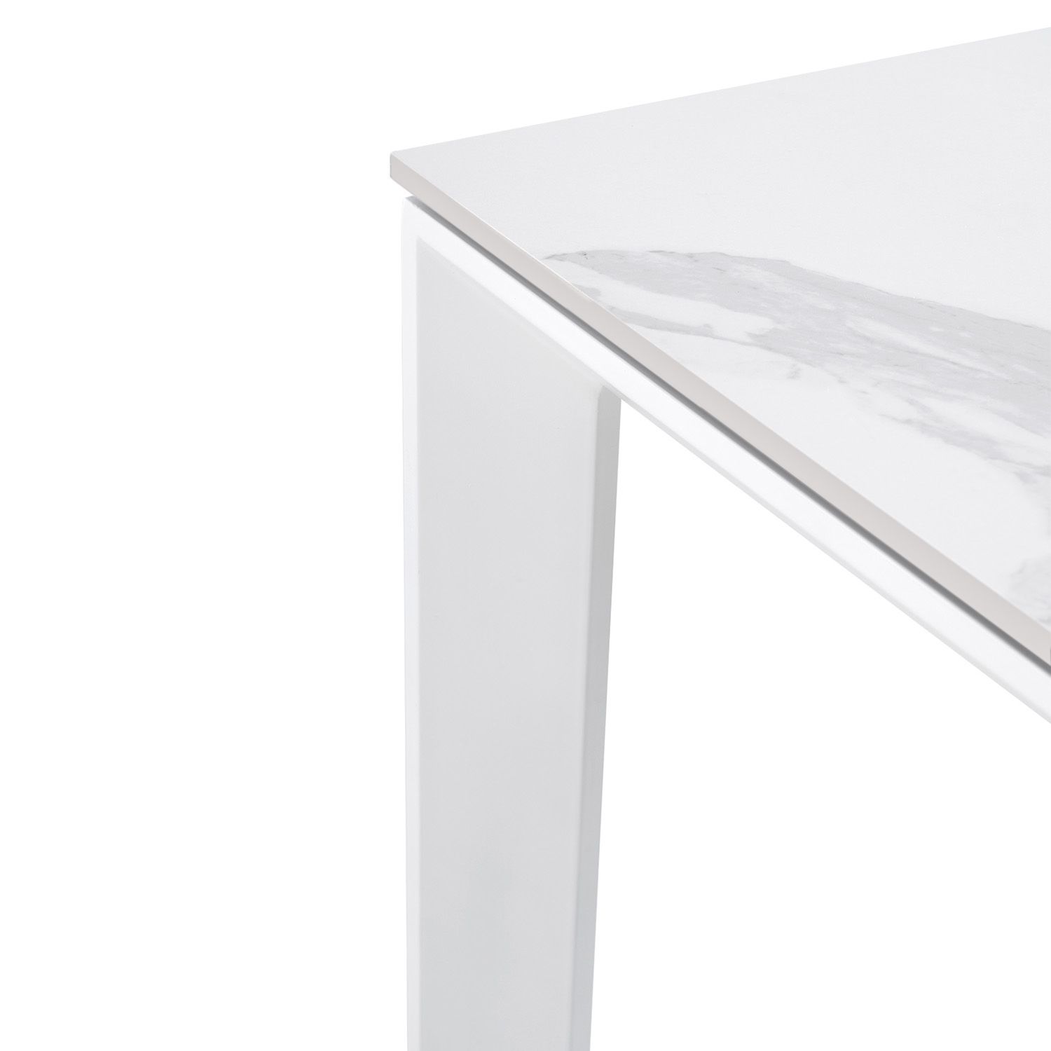 Mesa de comedor extensible en color blanco fabricada en porcelánico, combinado con metal.