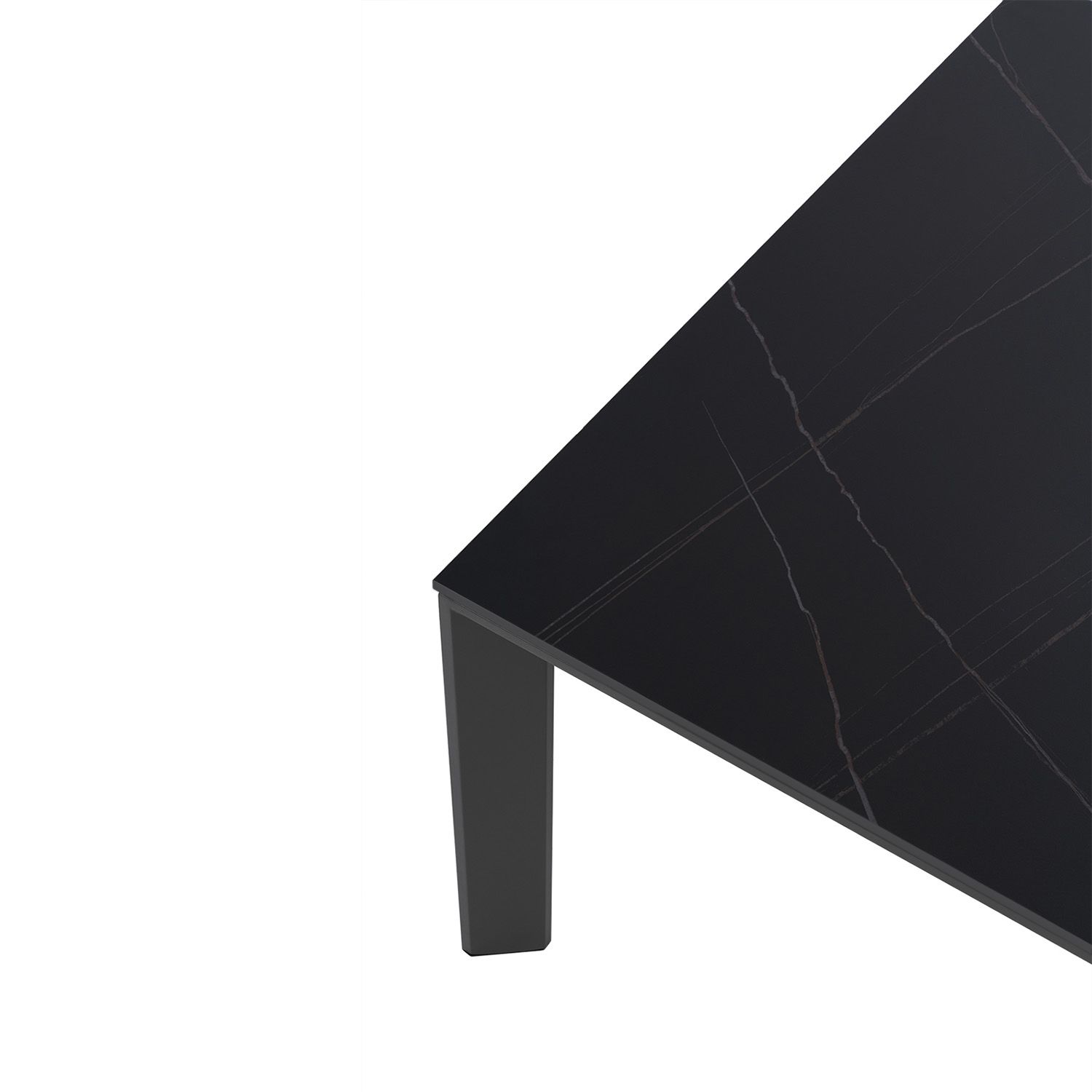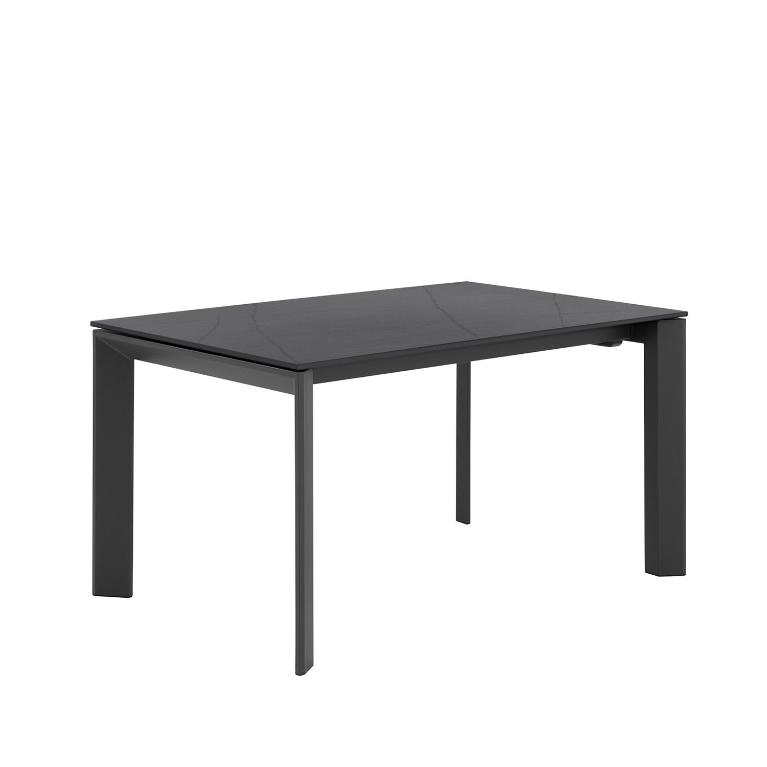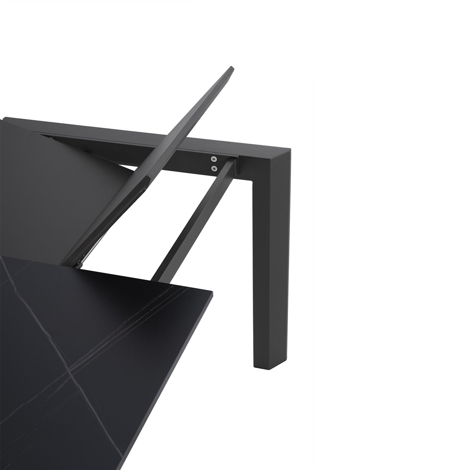 Mesa de comedor extensible en color negro fabricada en porecelánico, combinado con metal.