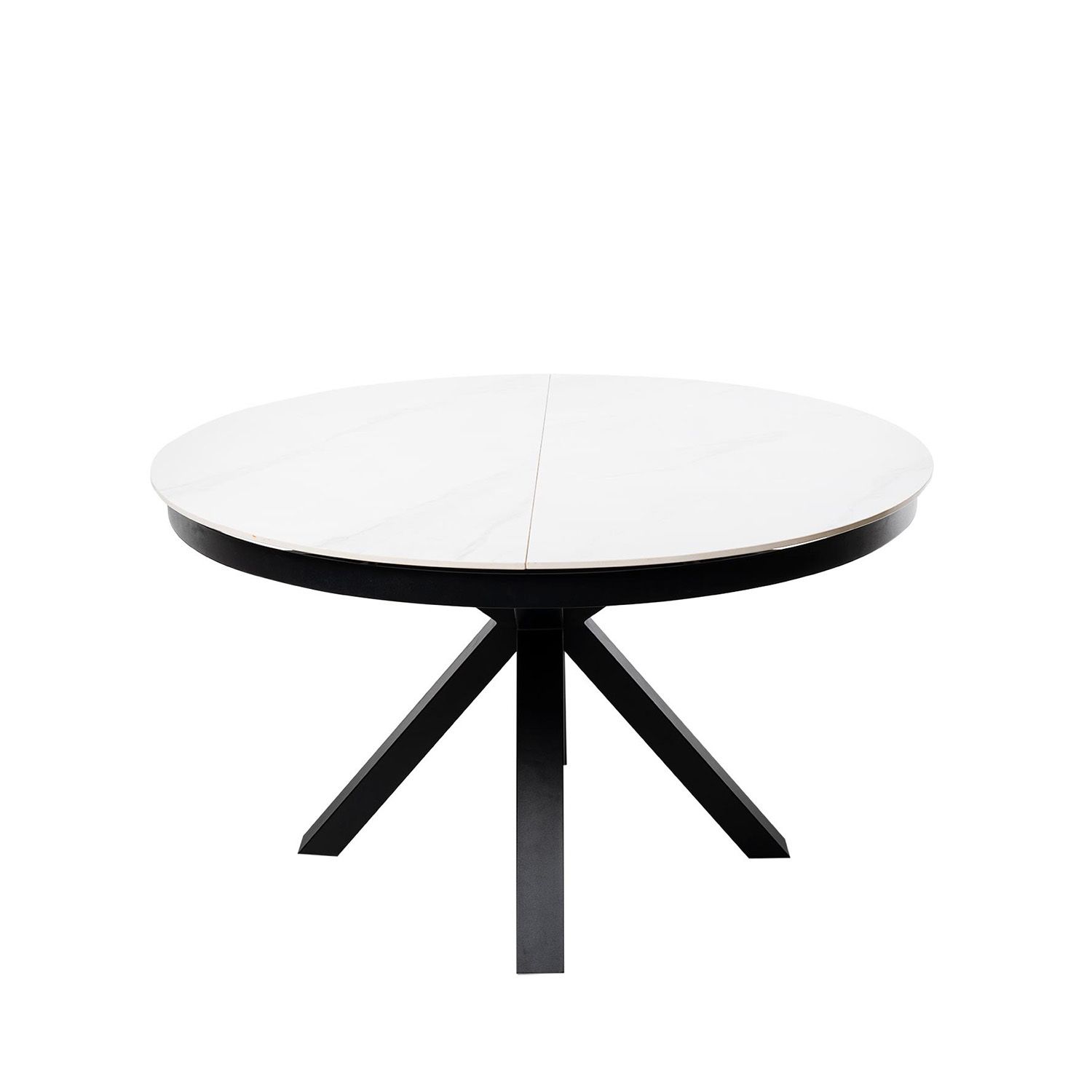 Mesa redonda extensible en color blanco y negro fabricada en porcelánico, combinado con metal.