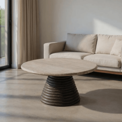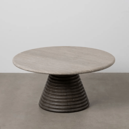 Elegancia y diseño se unen en esta mesa de comedor redonda, fabricada con una cubierta de mármol natural que aporta sofisticación y resistencia, combinada con una base cónica de madera de mango tallada con un delicado acabado en anillos. Su estilo moderno y atemporal la convierte en la pieza central perfecta para cualquier comedor.