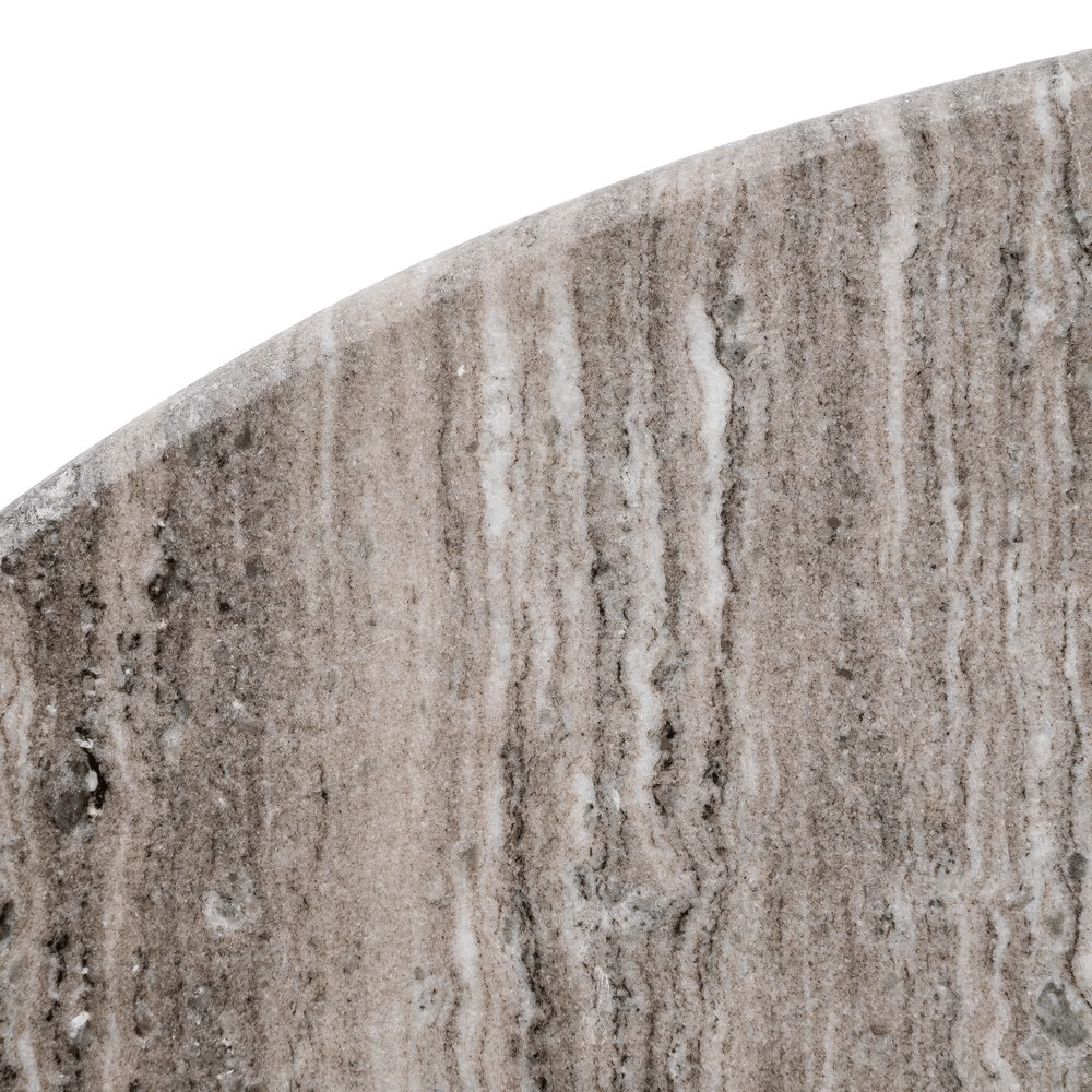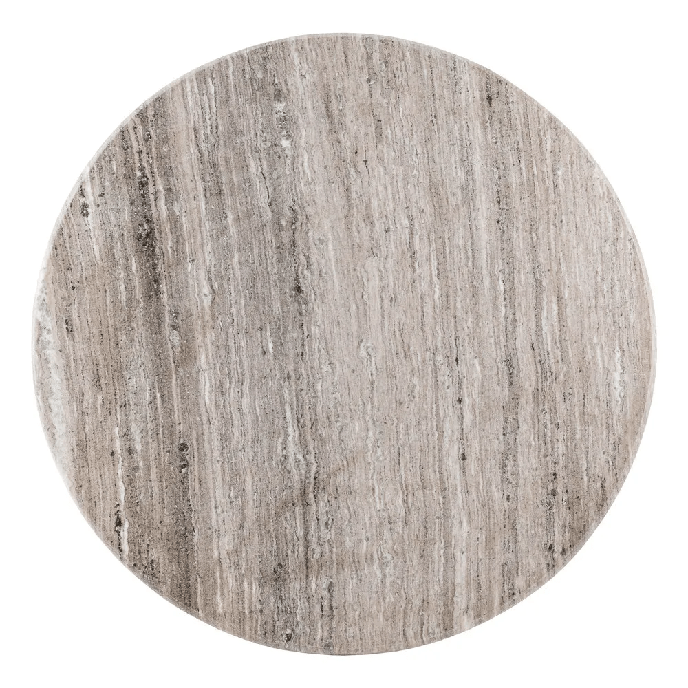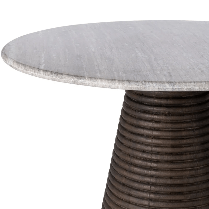 Mesa de comedor redonda en color gris y marrón fabricada en mármol, combinado con madera de mango.