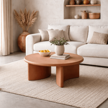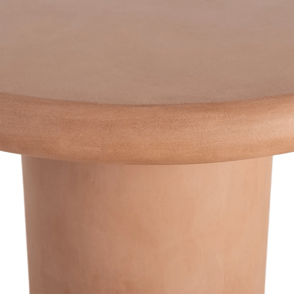 La mesa de comedor redonda en color teja destaca por su diseño escultórico y su estética cálida, inspirada en el estilo mediterráneo. Fabricada en MDF combinado con microcemento, ofrece una textura suave y una gran resistencia, ideal para el uso diario.