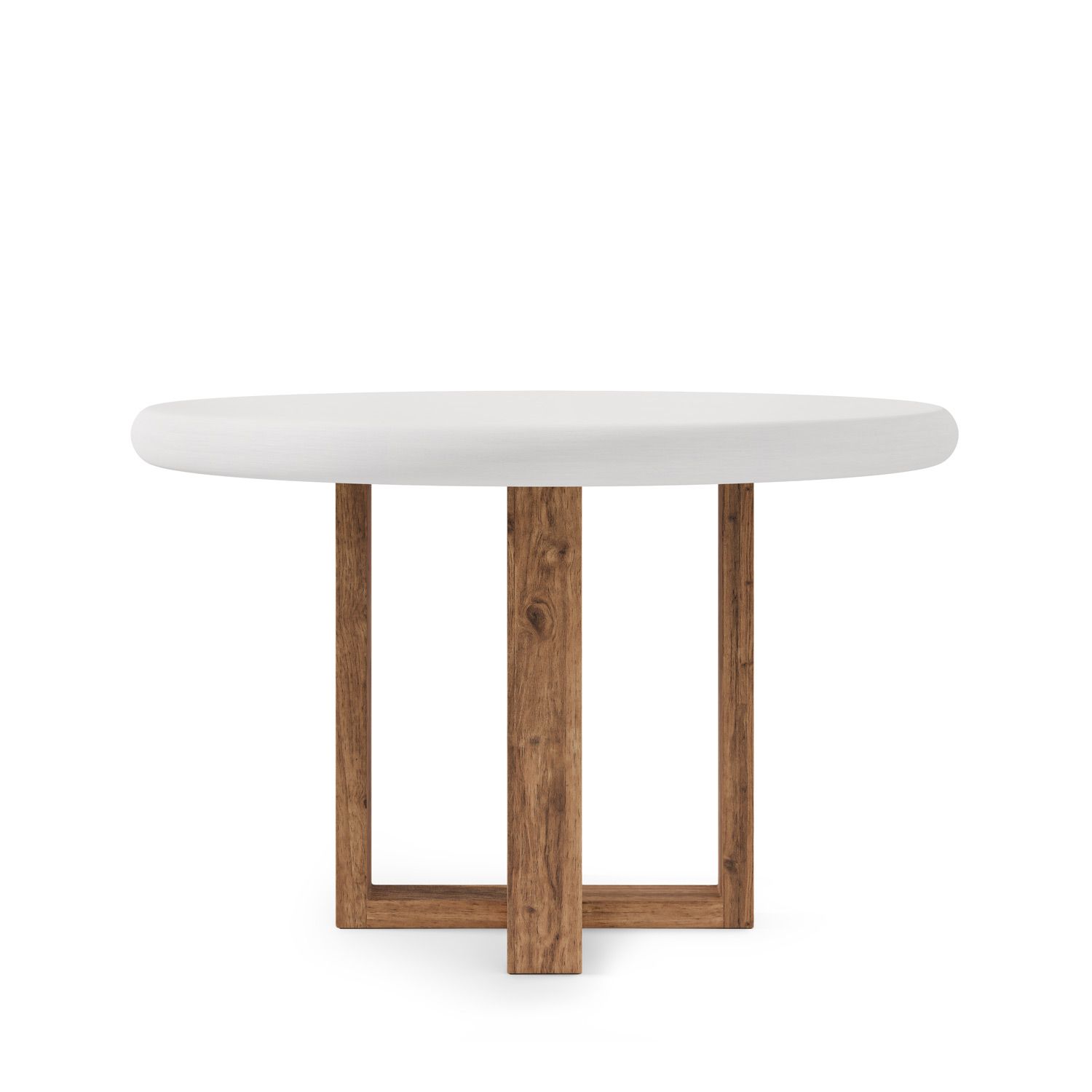 Mesa de comedor redonda en color blanco y roble fabricada en cemento, combinado con madera de hevea.