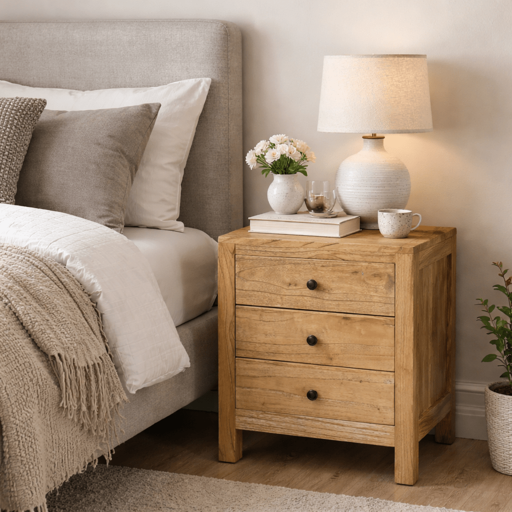 Ideal como mueble auxiliar junto a la cama o en cualquier rincón que necesite un toque natural y funcional.