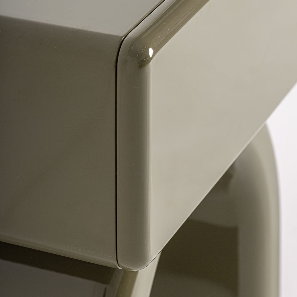 Fabricada en madera MDF y rematada con un acabado brillo, su superficie refleja la luz de manera sutil, realzando el color y aportando una sensación de amplitud. Incorpora un cajón práctico y discreto, ideal para mantener el orden y tener a mano lo esencial, sin renunciar al estilo.