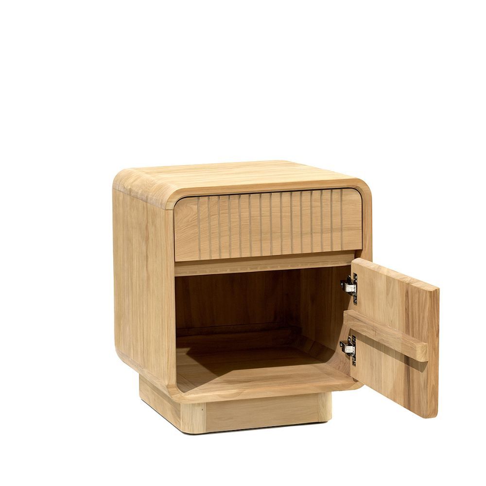 La mesita EYRE combina diseño contemporáneo y calidez natural en una pieza funcional y elegante. Fabricada a mano en madera maciza de teca, muestra vetas y tonalidades únicas que realzan su carácter artesanal. Sus formas redondeadas y sus detalles en lamas verticales aportan suavidad y estilo, creando una pieza que encaja a la perfección en dormitorios modernos y acogedores.
