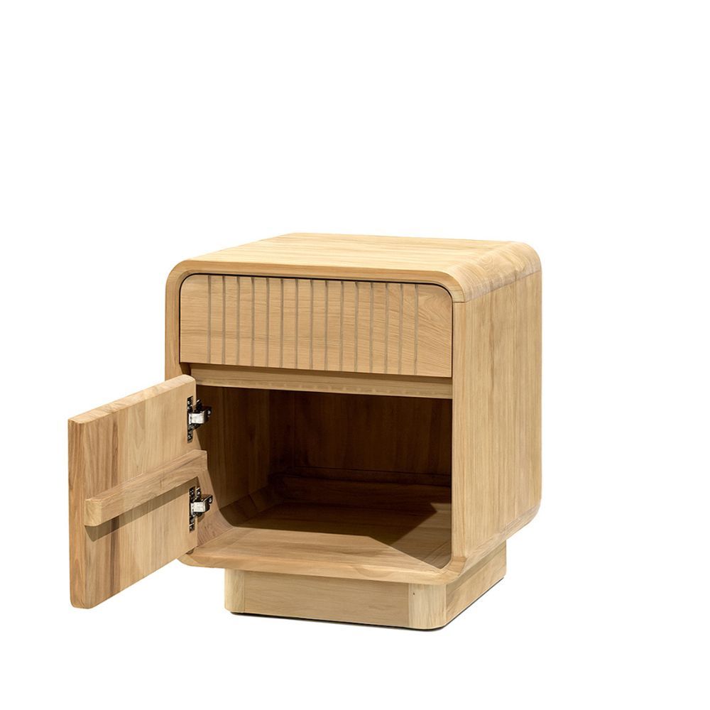 Su diseño con bordes redondeados y frontal de listones aporta un toque moderno y acogedor. Incluye 1 cajón en la parte superior para objetos pequeños y 1 puerta izquierda en la parte inferior que ofrece un espacio amplio de almacenamiento, manteniendo todo organizado y a mano.