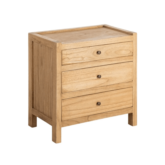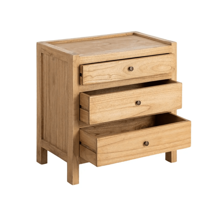 Con medidas de 65 x 40 x 65 cm, esta pieza compacta ofrece un excelente equilibrio entre funcionalidad y estética. Dispone de tres cajones: uno superior más pequeño y dos inferiores de mayor capacidad, perfectos para mantener tus objetos personales organizados y siempre a mano.