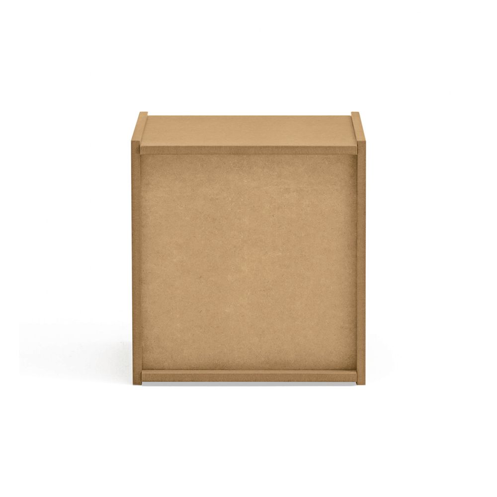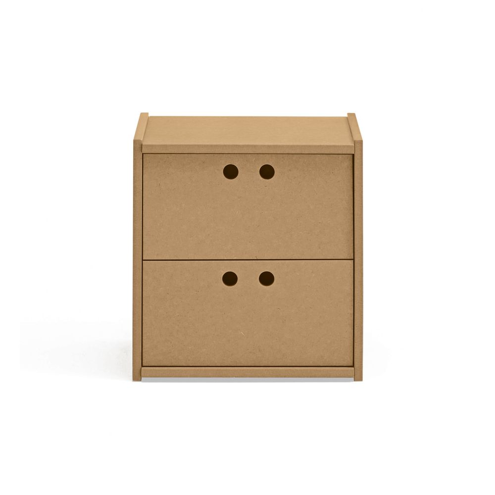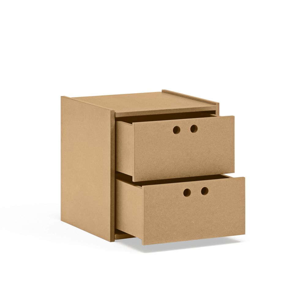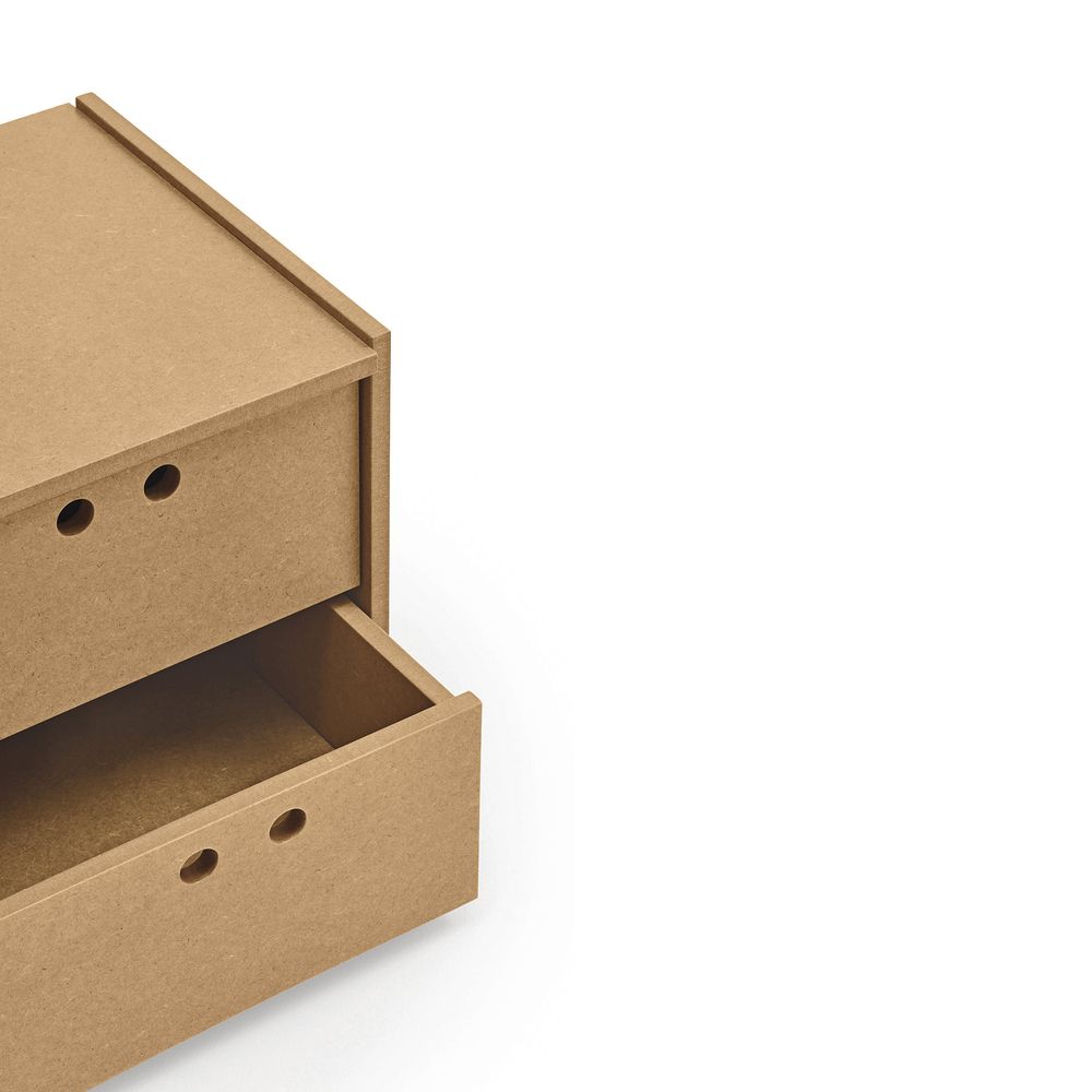 MDF visto como material de la colección. Agujeros en lugar de pomos. Superficies divisibles para facilitar el transporte y el empaquetado.