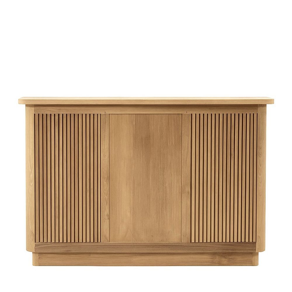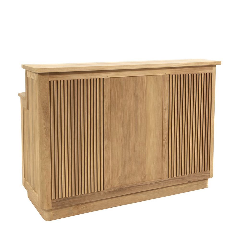 El mostrador EYRE combina la solidez de la madera maciza de teca con la elegancia atemporal de una encimera de mármol, creando una pieza sofisticada y funcional ideal para espacios comerciales o interiores con personalidad.