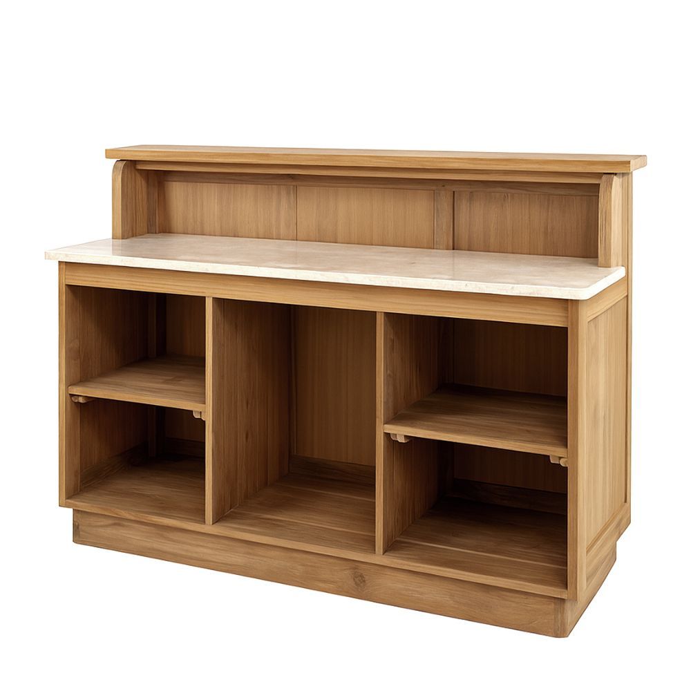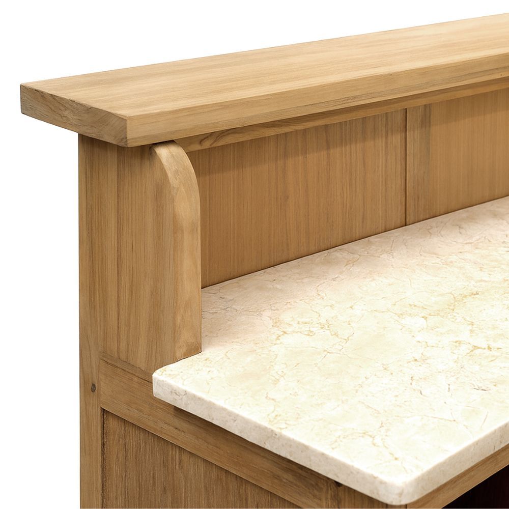 Mostrador en color natural fabricado en madera de teca, combinado con mármol.