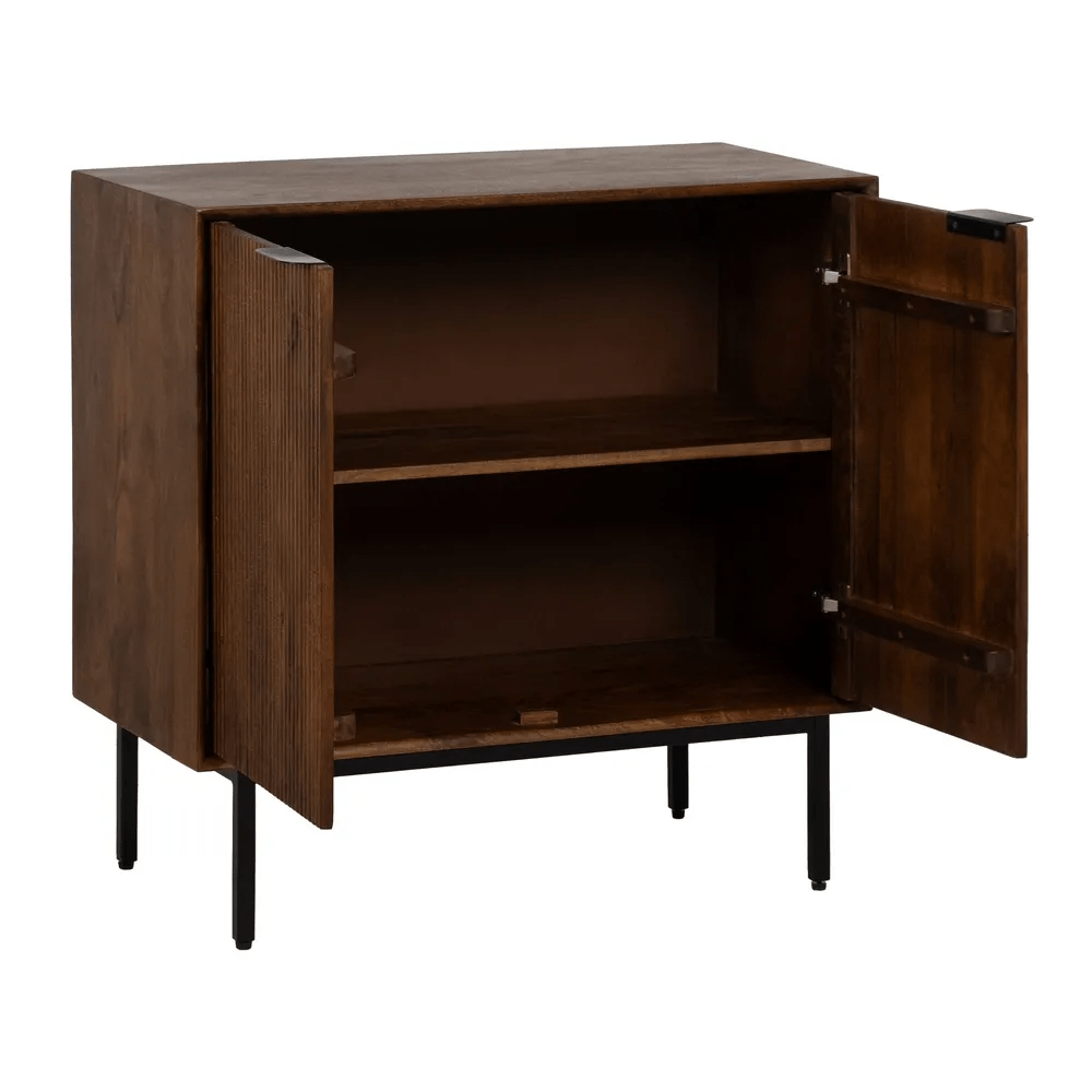 Con unas medidas de 80 x 40 x 80 cm, este mueble ofrece una solución práctica y estética para el almacenamiento. Dispone de dos puertas acanaladas de 38,5 x 57 cm que aportan textura y carácter al diseño, junto con una leja interior para organizar fácilmente tus objetos personales. Sus patas metálicas de 18 cm de altura elevan la estructura, aportando ligereza visual y facilitando la limpieza.