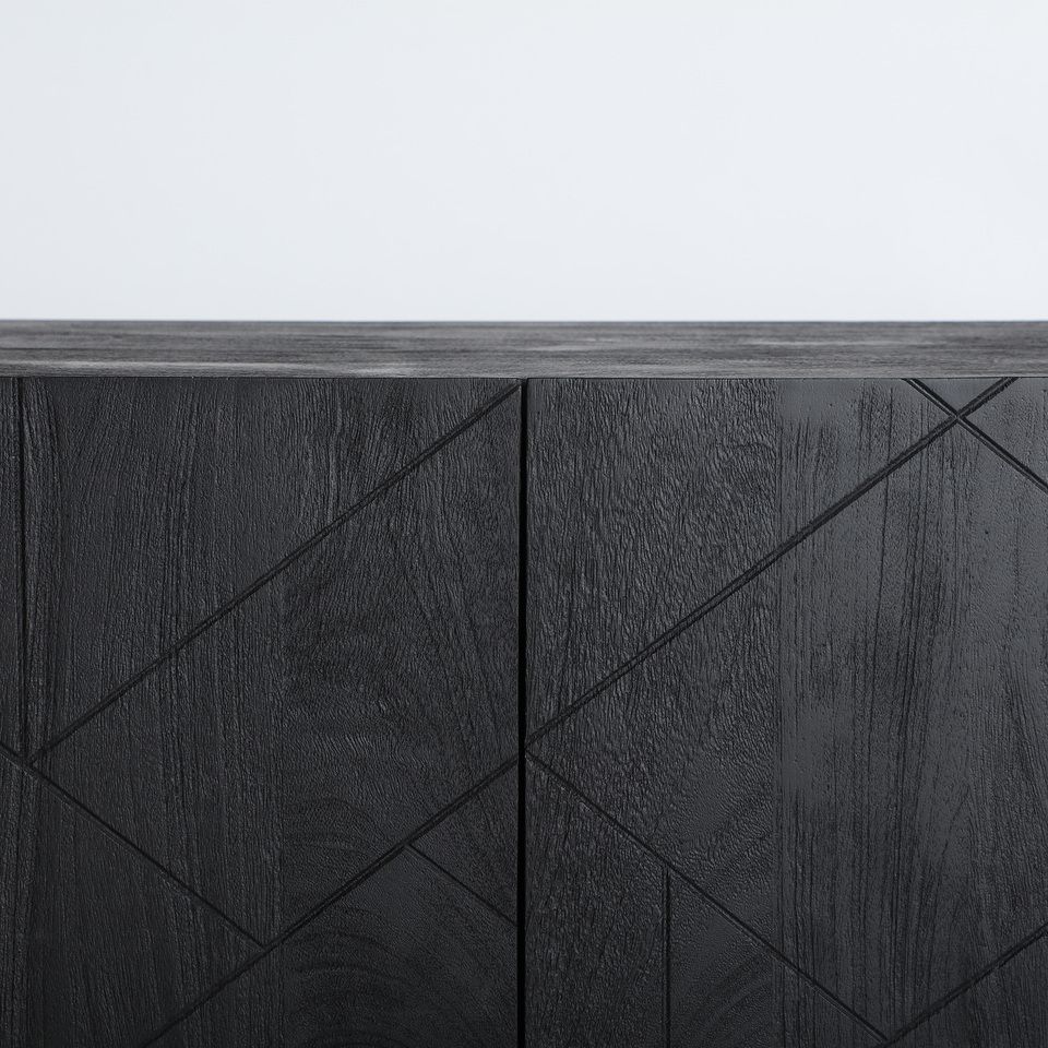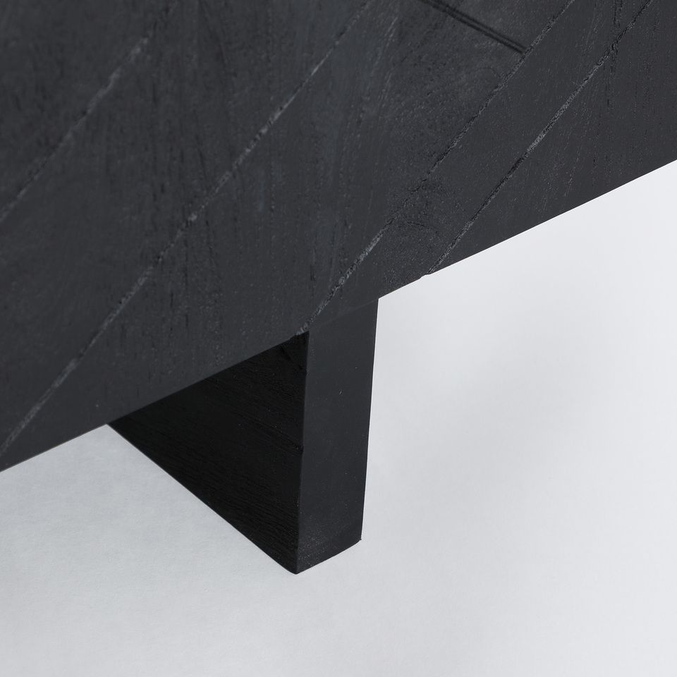 El mueble de televisión Bouloc es una pieza de diseño contemporáneo que destaca por su fuerte identidad visual y su estética sofisticada. Fabricado en madera de mango con acabado negro, su frontal decorado con líneas geométricas aporta profundidad, carácter y un estilo moderno muy marcado, ideal para salones actuales, urbanos o de inspiración industrial.