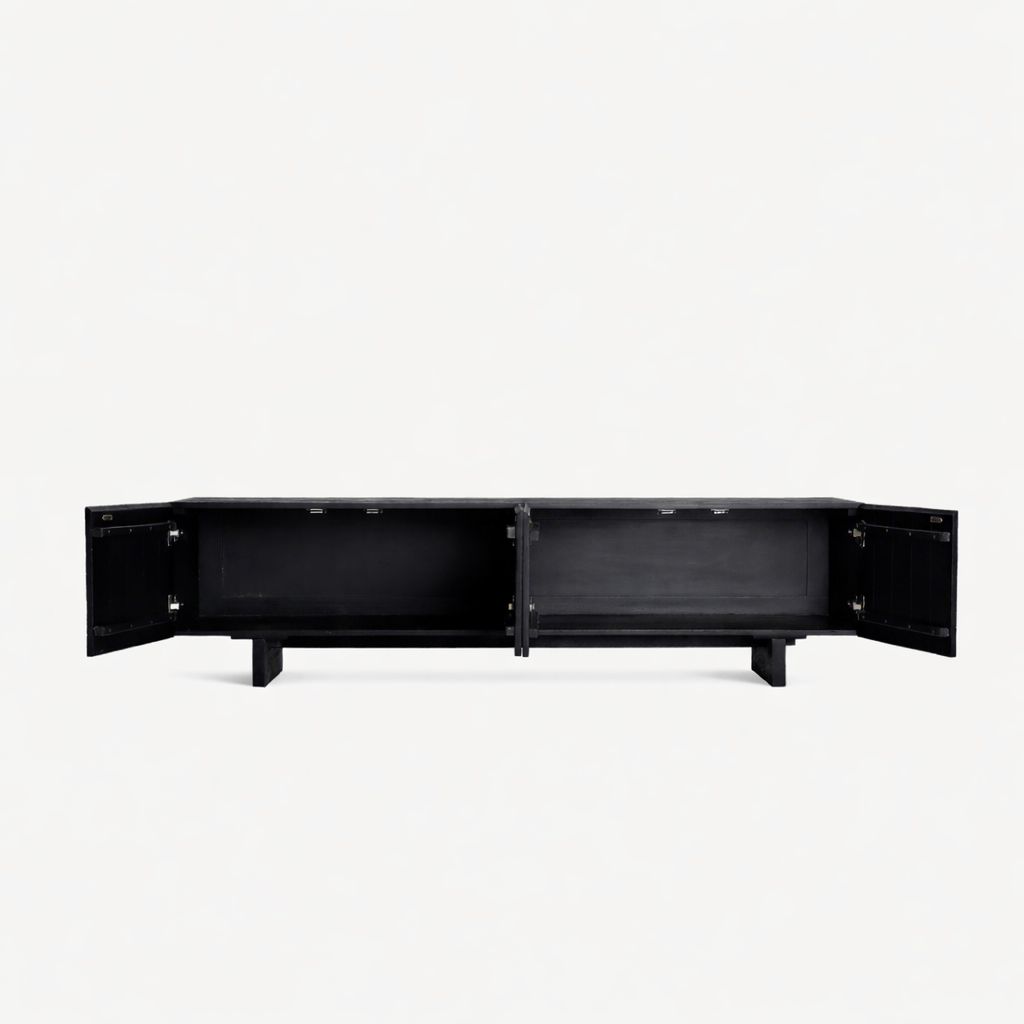 Dispone de cuatro puertas que ocultan dos amplios huecos interiores, perfectos para organizar dispositivos multimedia, consolas o almacenaje general, manteniendo el espacio limpio y ordenado. Su diseño sin estantes refuerza la sensación de amplitud y simplicidad visual.