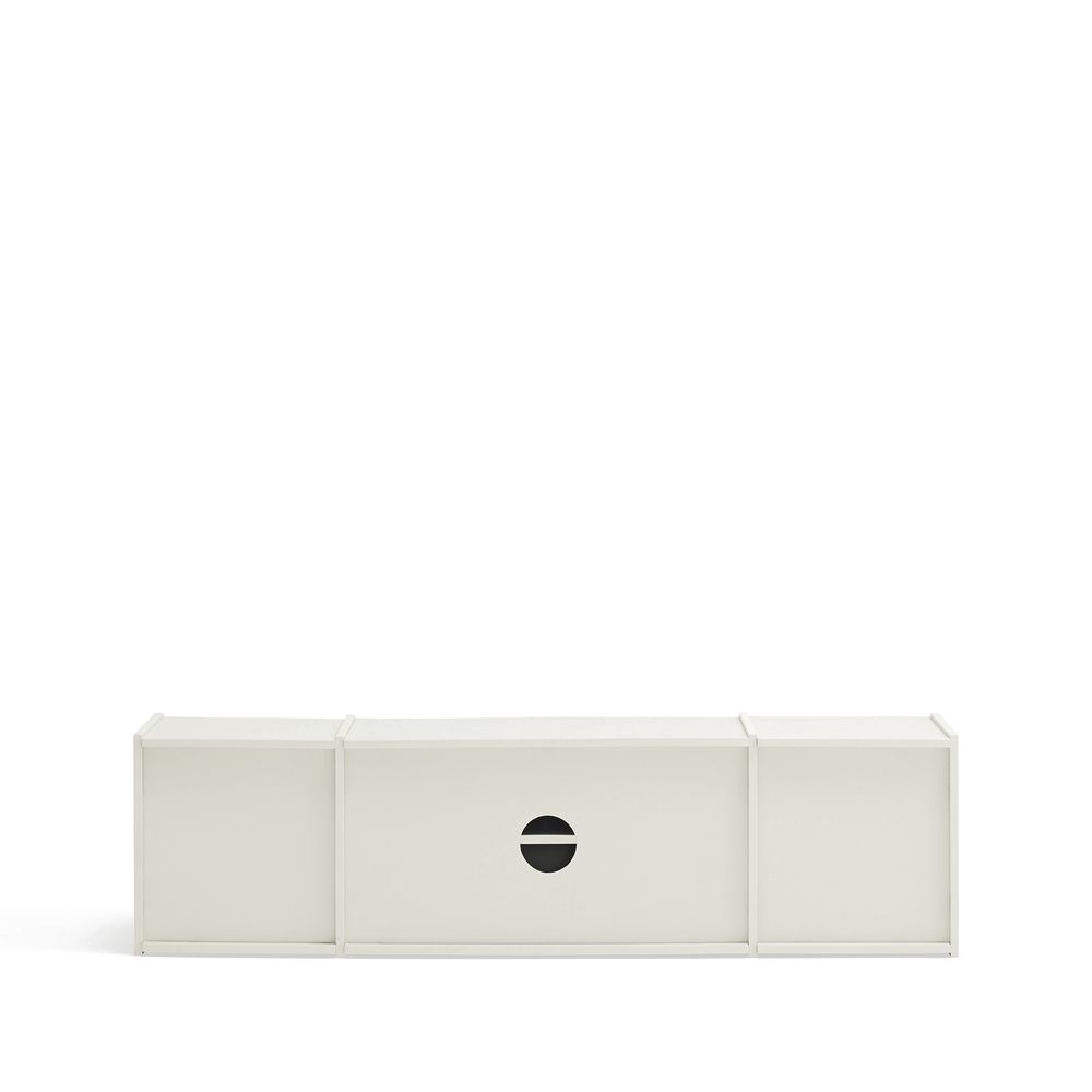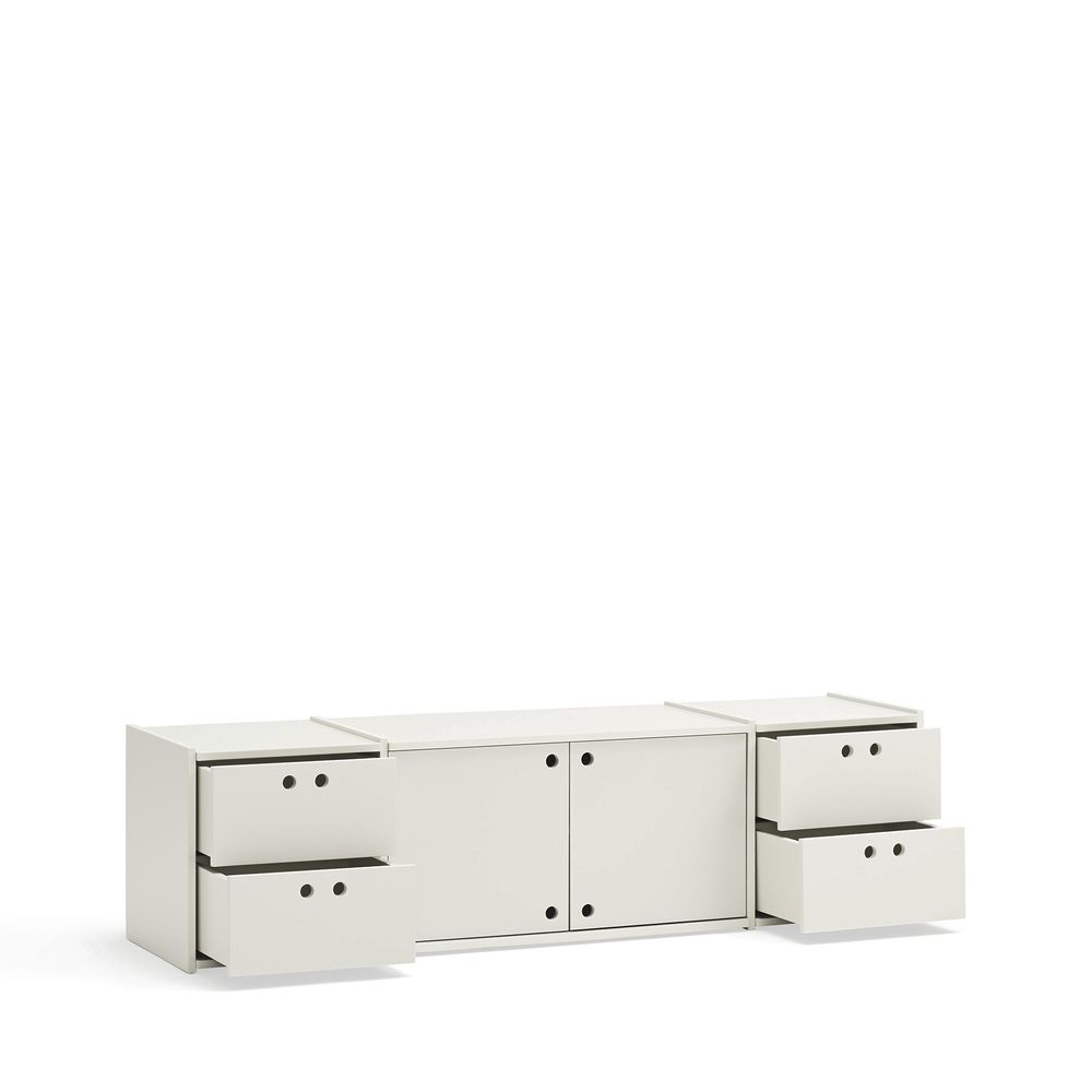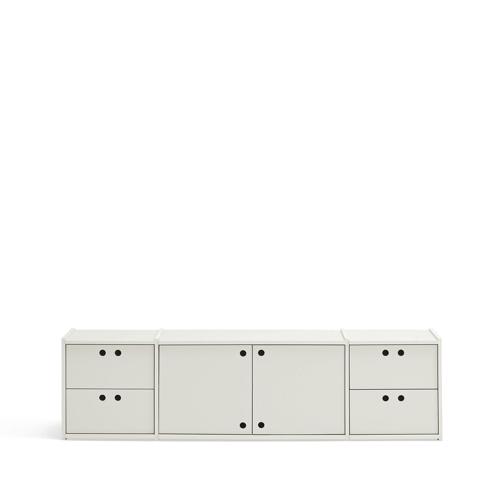 MDF visto como material de la colección. Agujeros en lugar de pomos. Superficies divisibles para facilitar el transporte y el empaquetado.