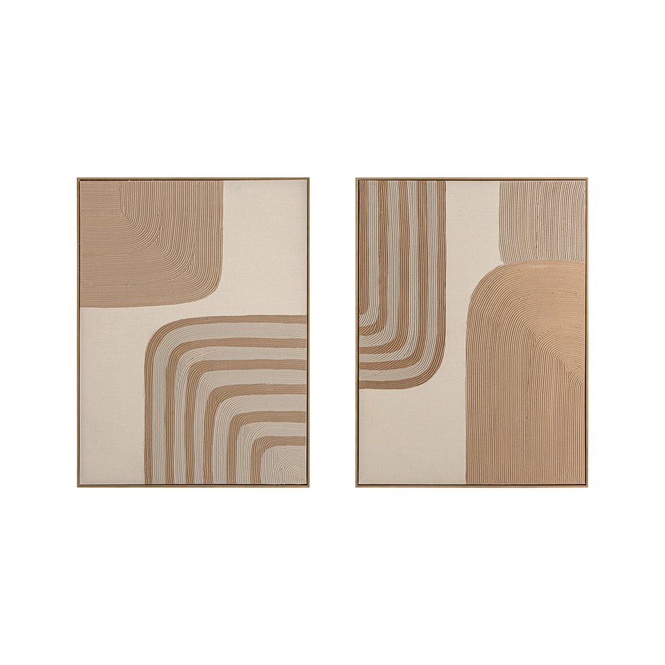 Set de cuadros en tonos marrón fabricados en lienzo, combinado con madera de pino.