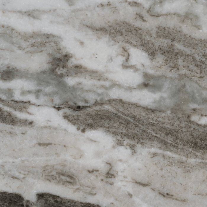 Cada mesa cuenta con una sólida base de hierro en acabado bronce que aporta un toque moderno e industrial, contrastando con la superficie de mármol veteado en tonos neutros que aporta luminosidad y textura.
