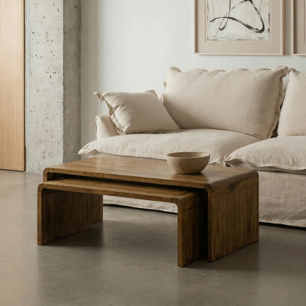 Este set de 2 mesas de centro combina diseño contemporáneo y calidez natural, convirtiéndose en una opción versátil y sofisticada para el salón. Fabricadas en madera maciza de mango, destacan por su solidez, sus vetas únicas y su acabado en color miel, que aporta luminosidad y un ambiente acogedor al espacio.