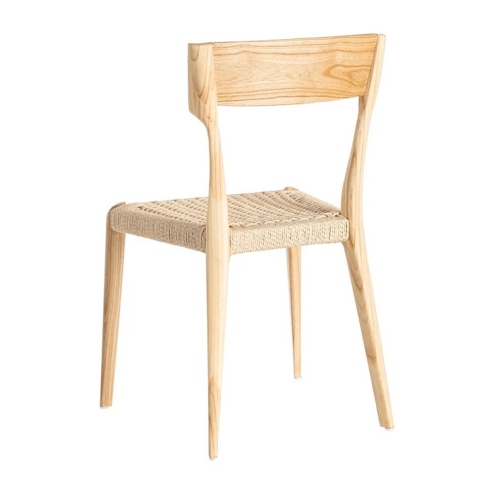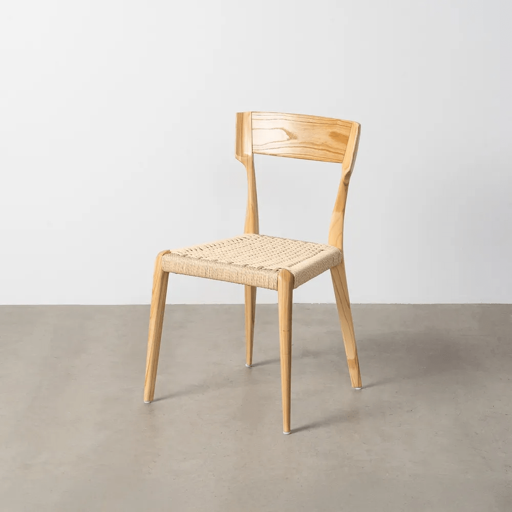 Elegancia, naturalidad y resistencia se unen en esta silla de estilo nórdico. Fabricada en madera maciza de fresno y con asiento trenzado a mano en cuerda de papel, aporta calidez y ligereza a cualquier espacio. Su diseño de líneas depuradas encaja tanto en comedores modernos como en ambientes mediterráneos o contemporáneos.