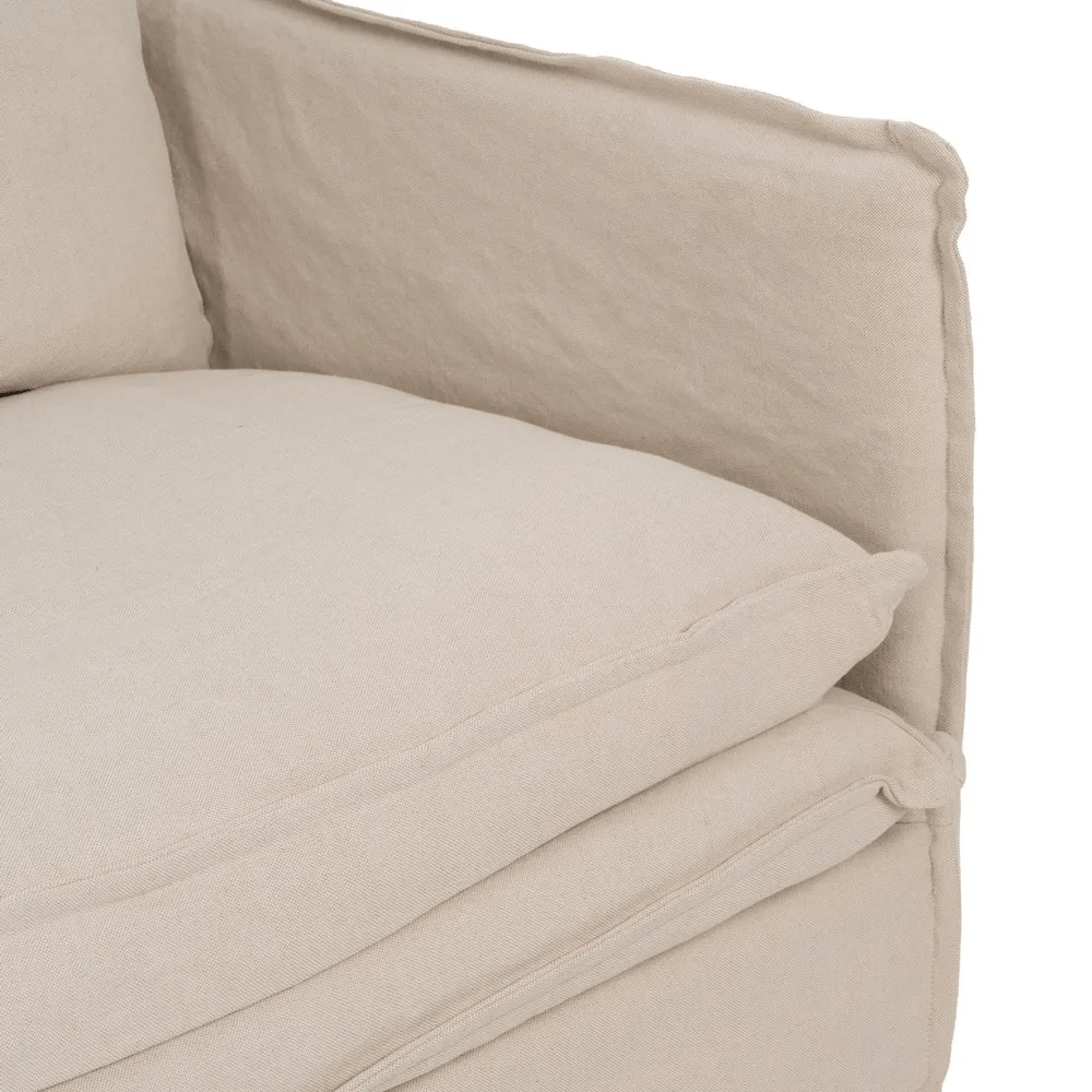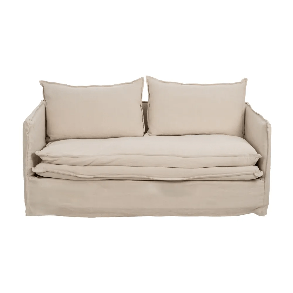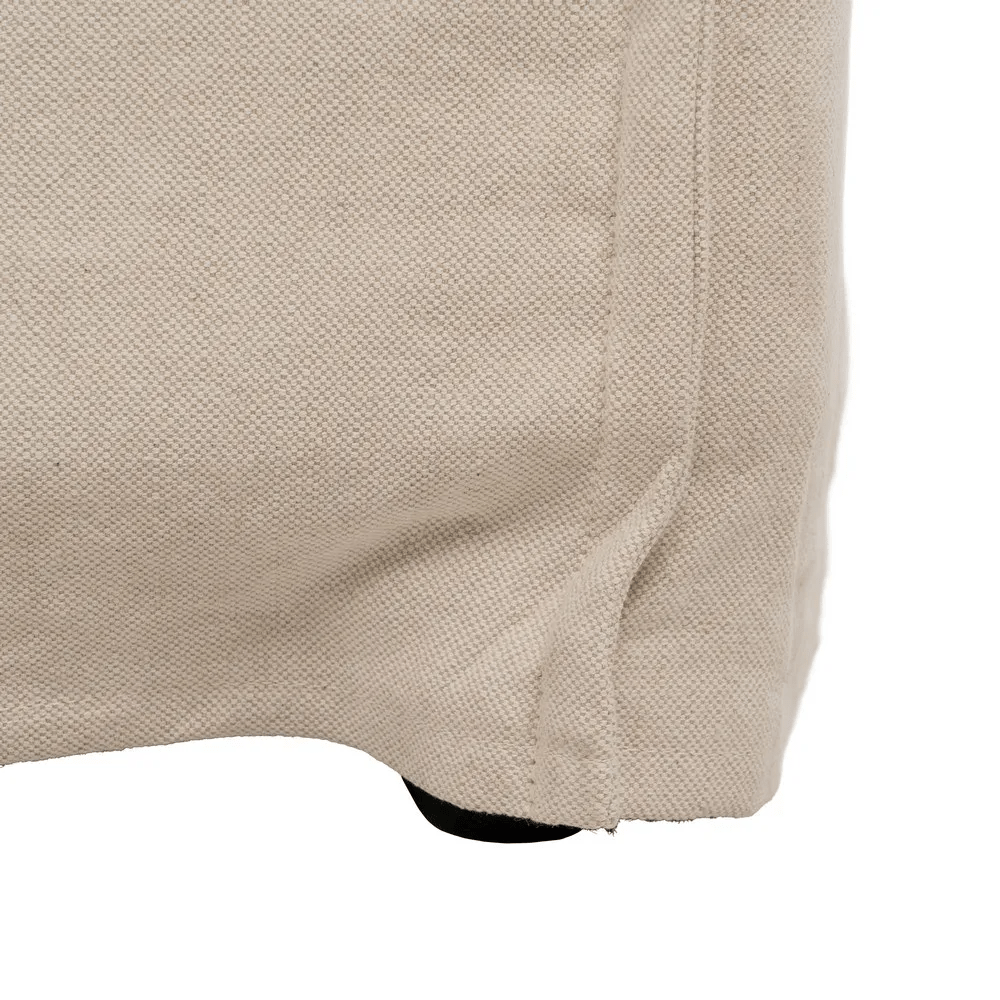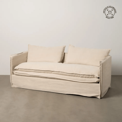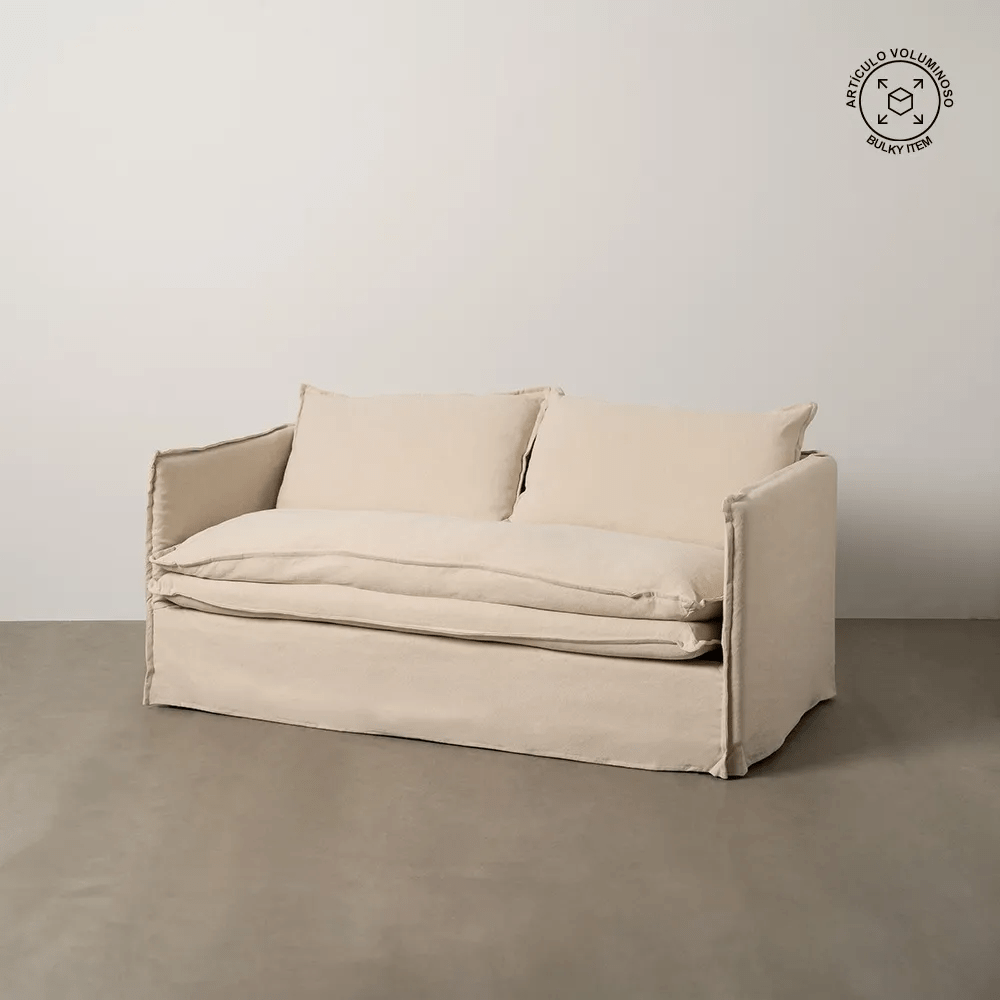 Aporta calidez y elegancia a tu salón con este sofá de 2 plazas en color crema, una pieza diseñada para quienes buscan confort, estilo atemporal y materiales de calidad. Su tapizado en 40% lino y 60% algodón ofrece un tacto natural y agradable, además de ser desenfundable para facilitar la limpieza y el mantenimiento.