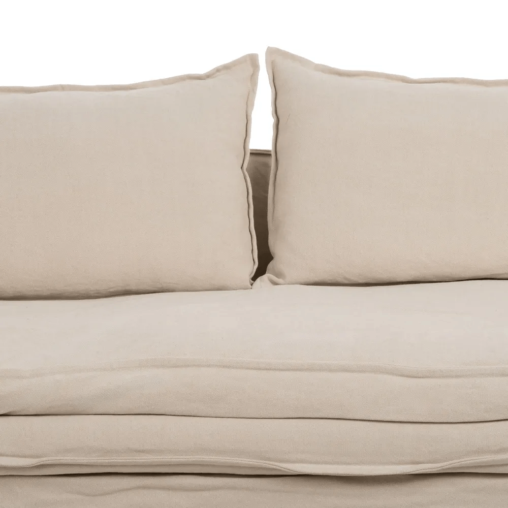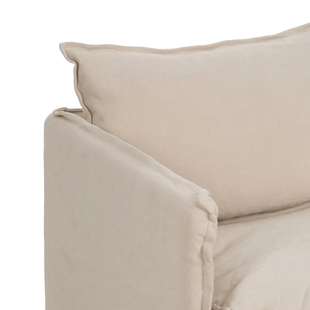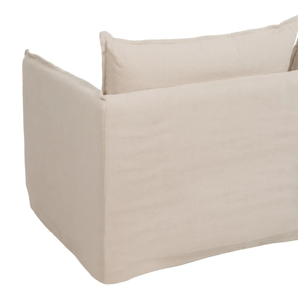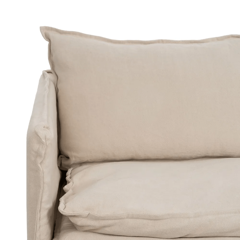 Aporta calidez y elegancia a tu salón con este sofá de 2 plazas en color crema, una pieza diseñada para quienes buscan confort, estilo atemporal y materiales de calidad. Su tapizado en 40% lino y 60% algodón ofrece un tacto natural y agradable, además de ser desenfundable para facilitar la limpieza y el mantenimiento.
