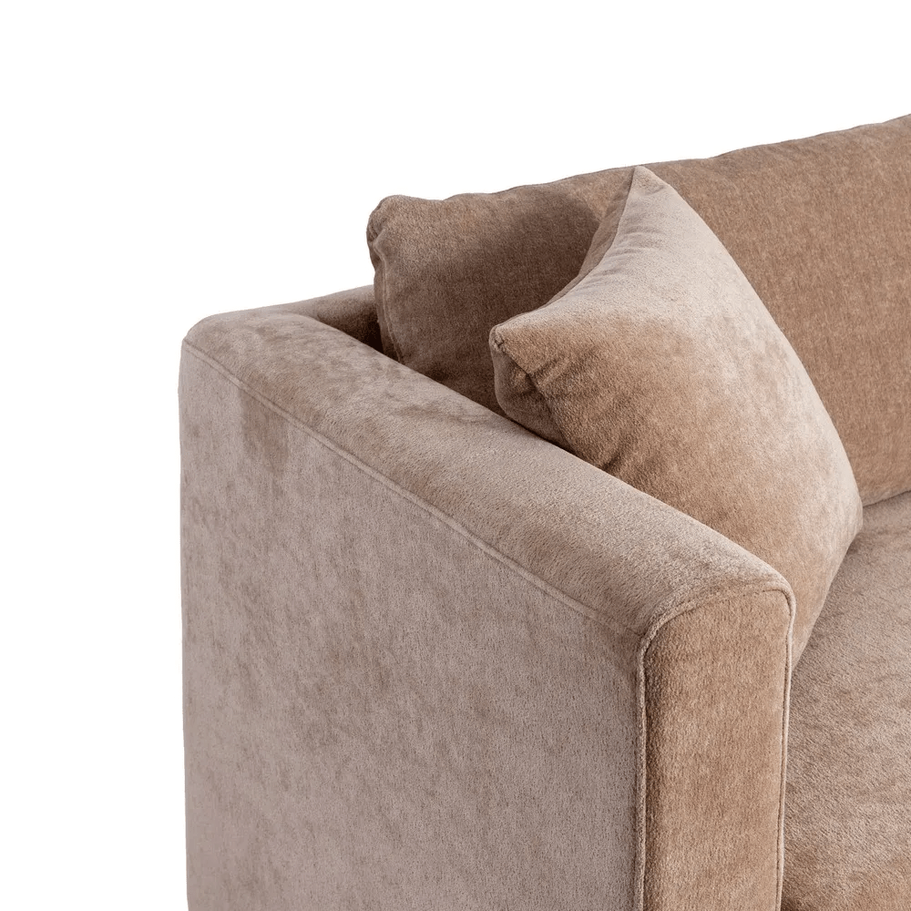 Sofá en color taupe fabricado en tela, combinado con madera conglomerada y madera de caucho.