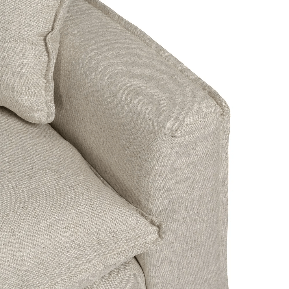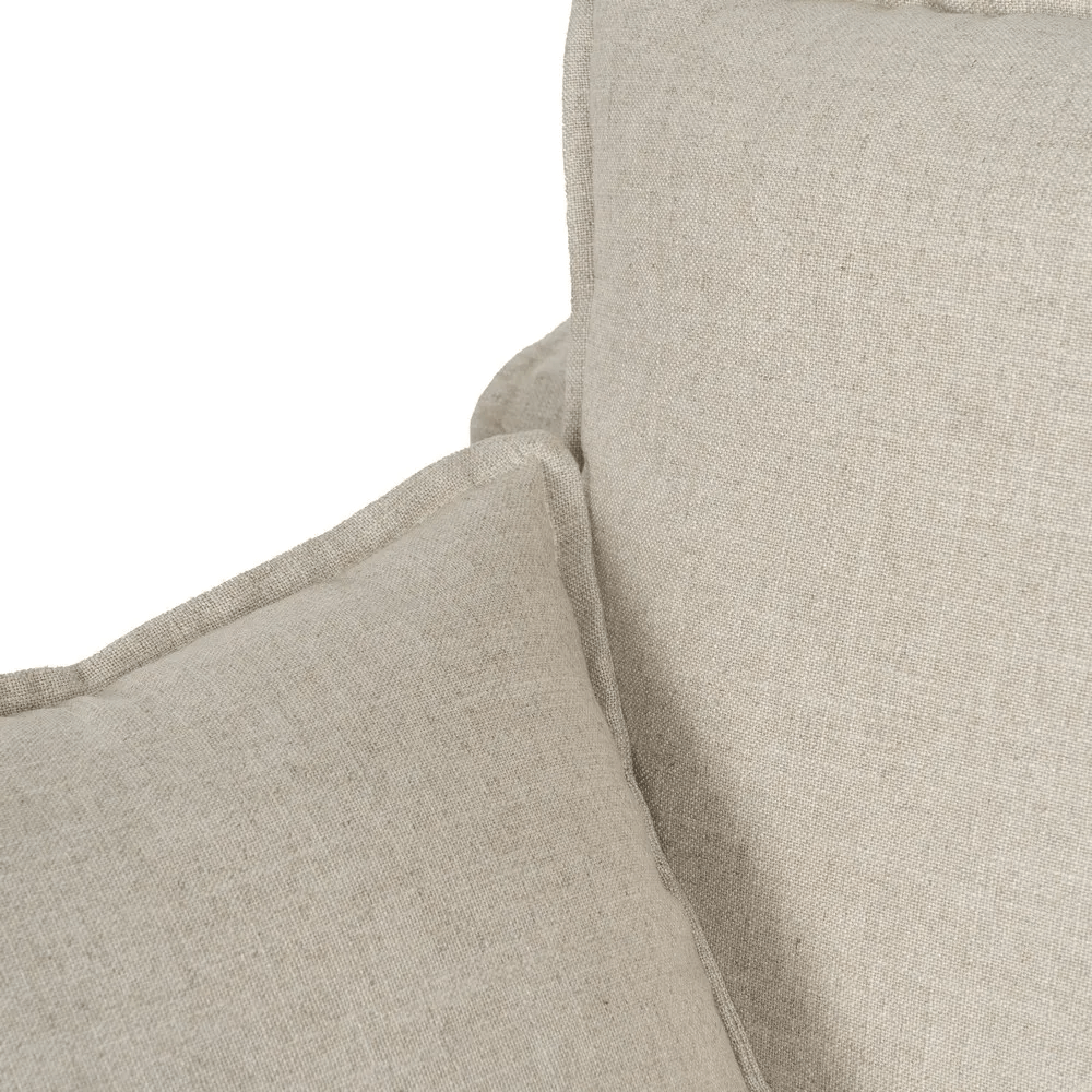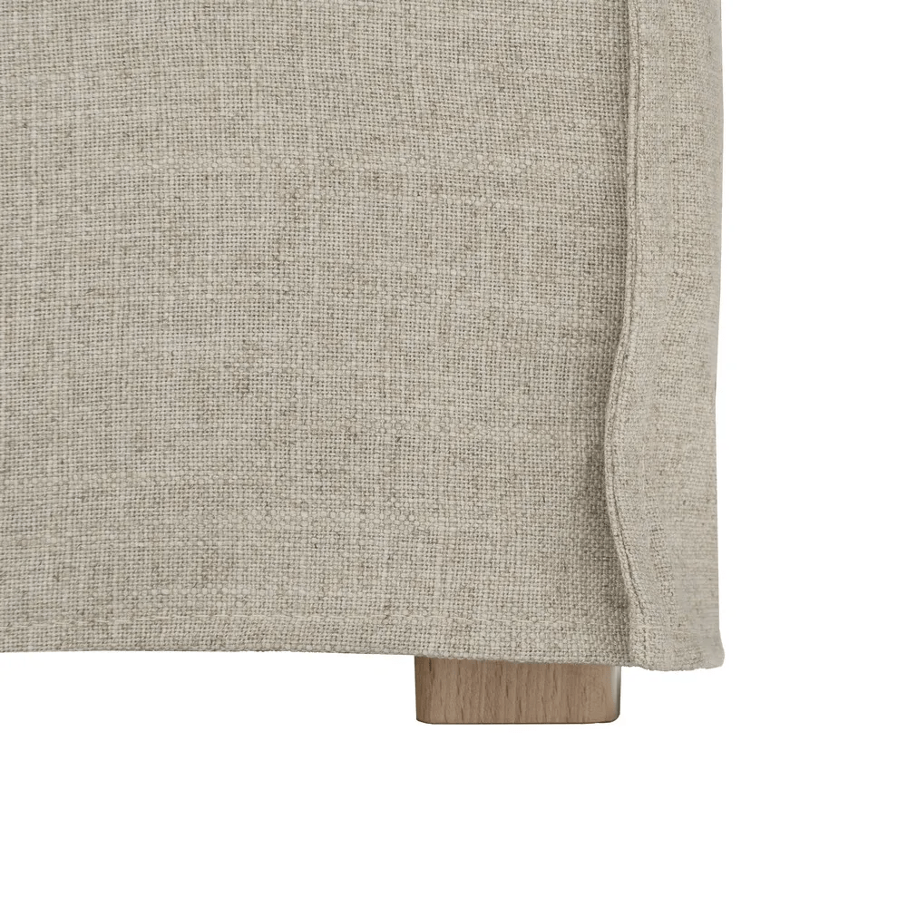 El sofá es totalmente desenfundable, lo que facilita su mantenimiento y prolonga su vida útil. Está tapizado en un tejido de alta calidad compuesto por 70% viscosa y 30% lino, con un gramaje de 390 g/m², que ofrece una textura agradable, resistente y natural al tacto.